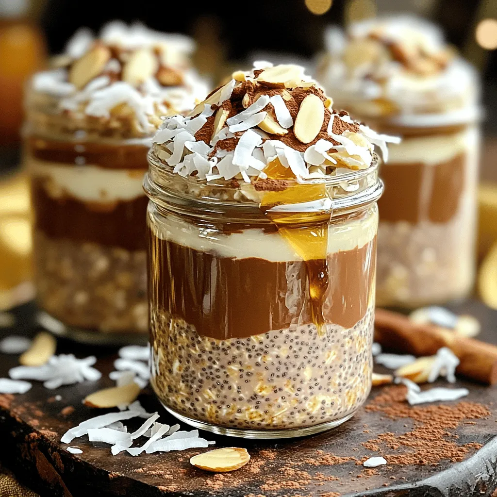 To make Almond Joy Overnight Oats, you need these key items: - 1 cup rolled oats - 1 cup almond milk (or milk of choice) - 1 tablespoon chia seeds - 2 tablespoons maple syrup (adjust to taste) - 1/4 cup shredded unsweetened coconut - 1/4 cup slivered almonds - 2 tablespoons cocoa powder - 1/2 teaspoon vanilla extract - Pinch of salt These ingredients blend together to create a tasty, filling breakfast. You can add more fun flavors to your oats. Here are some ideas: - A dash of cinnamon for warmth - A spoonful of nut butter for creaminess - A handful of chocolate chips for sweetness - Fresh fruit like bananas or berries for a fruity twist These add-ins make your oats even more exciting. When serving, toppings can elevate your dish. Try these: - Extra shredded coconut for crunch - More slivered almonds for a nutty bite - A drizzle of chocolate syrup for indulgence - Sliced bananas or berries for freshness These toppings add both flavor and style to your breakfast. Start by gathering your dry ingredients. In a medium bowl or jar, add: - 1 cup rolled oats - 1 tablespoon chia seeds - 2 tablespoons cocoa powder - A pinch of salt Mix these together well. Make sure everything is evenly spread. This step is key for flavor. Next, grab another bowl. Pour in: - 1 cup almond milk (or your favorite milk) - 2 tablespoons maple syrup (adjust if you like it sweeter) - 1/2 teaspoon vanilla extract Stir these together until they blend nicely. Your wet mix will add smoothness to your oats. Now, take the wet mix and pour it over the dry mix. Stir gently until everything is combined. Then, fold in: - 1/4 cup shredded unsweetened coconut - 1/4 cup slivered almonds Once mixed, divide your oats into jars or leave them in the bowl. Cover them with a lid or plastic wrap. Place them in the fridge overnight or for at least 4 hours. This lets the oats soak and become creamy. In the morning, stir them again. If you want, add a splash of almond milk for a smoother texture. Top with extra coconut and almonds before you dig in! To adjust the sweetness in your Almond Joy Overnight Oats, start with the maple syrup. Use 2 tablespoons as a base. If you like it sweeter, add more syrup, one teaspoon at a time. You can also try honey or agave if you prefer. Taste as you go. This way, you make it just right for you. Store your overnight oats in airtight jars. Glass jars work great. They keep your oats fresh and tasty. Make sure to seal them well. If you use plastic wrap, cover it tightly. This helps prevent drying out. Keep your oats in the fridge for up to five days. For the best texture, use rolled oats. They soak up the almond milk well. If your oats seem too thick in the morning, add a splash of almond milk. Stir it in to loosen things up. You want your oats creamy but not runny. Adjust to your liking for the perfect bite every time. {{image_2}} You can easily make this recipe dairy-free and vegan. Just swap almond milk for coconut milk or oat milk. Both options work great. They keep the taste rich and creamy. If you want more creaminess, use full-fat coconut milk. This change adds a nice coconut flavor. Feel free to mix up your nuts and seeds. Instead of slivered almonds, try walnuts or pecans. They add a different crunch. You can also use sunflower seeds or pumpkin seeds for some extra nutrients. Each choice brings unique flavors to your overnight oats. Want to spice things up? Add a pinch of cinnamon or a dash of nutmeg. Both spices enhance the chocolate flavor. You can also try other extracts like almond or coconut. Just a few drops will give your oats a new twist. These simple changes keep your breakfast exciting every time. Overnight oats stay fresh for about five days in the fridge. This means you can make a batch and enjoy them throughout the week. I love making a big jar on Sunday. You can grab a healthy breakfast each morning. Use airtight containers to keep your oats fresh. Glass jars work well because they don't stain and seal tightly. You can also use plastic containers with tight lids. Just make sure they are clean and dry before adding your oats. You can enjoy your Almond Joy Overnight Oats cold or warm. If you prefer them warm, heat them in the microwave for about 30 seconds. Stir them to get even heat. If you like them cold, just grab a spoon and dig in right from the fridge. Yes, you can prepare Almond Joy Overnight Oats in advance. Make them the night before or up to three days ahead. This recipe is perfect for meal prep. Just mix the oats, chia seeds, cocoa powder, and salt. Then add the wet ingredients and stir. Store in the fridge until you're ready to eat. You will save time and enjoy a quick breakfast. If you don't have almond milk, you can use any milk you like. Dairy milk, soy milk, or oat milk work well. Each choice changes the flavor a bit but adds creaminess. Use what you enjoy most. You can even try coconut milk for a richer taste. To lower the calories in Almond Joy Overnight Oats, make a few easy swaps. First, use less maple syrup or substitute it with a zero-calorie sweetener. You can also reduce the amount of nuts and coconut. This will cut down on fat and calories. Choose a low-calorie milk option, too. These small changes will help you enjoy this treat while staying on track. Almond Joy overnight oats offer a simple way to enjoy a tasty breakfast. This blog covered key ingredients, the preparation steps, and tips for perfecting your mix. Customizing sweetness and finding the right texture make a big difference. Whether you want dairy-free options or creative add-ins, choices abound. Finally, proper storage lets your oats stay fresh longer. With these ideas, you can make a meal that feels special every time. Enjoy your morning treat!