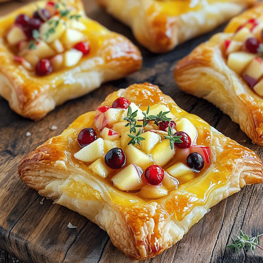 - 1 sheet of puff pastry, thawed - 1 medium apple, cored and finely diced - 1/2 cup fresh cranberries, chopped (or dried cranberries) - 4 oz Brie cheese, rind removed and cut into small pieces - 2 tablespoons honey - 1 teaspoon fresh thyme leaves These ingredients come together to create a perfect mix of sweet and savory flavors. The puff pastry forms a flaky and buttery shell. The apple adds a crisp texture, while cranberries bring a tart punch. Brie offers creamy richness, making every bite delightful. Honey adds a touch of sweetness, and thyme gives it a fresh herbal note. - Sea salt - Freshly cracked black pepper These seasonings can enhance the flavors. A little sea salt boosts sweetness, while black pepper adds a hint of spice. Both are optional but recommended for a well-rounded taste. - Baking sheet - Parchment paper - Mixing bowl - Rolling pin Having the right tools makes cooking easier. A baking sheet lined with parchment paper ensures easy cleanup. A mixing bowl helps combine your filling, and a rolling pin is needed to flatten the puff pastry. With these tools, you can make your Apple Cranberry Brie Puff Pastry Bites with ease and confidence. First, you need to thaw the puff pastry. Leave it in the fridge overnight or on the counter for about 30 minutes. Once it's soft, place it on a lightly floured surface. Roll it out gently with a rolling pin. You want to smooth out any creases and make it slightly bigger. Next, cut the pastry into 2-inch squares. Use a sharp knife or a pizza cutter for clean edges. This will give you perfect little pockets for your filling. Now it’s time to make the filling. Take one medium apple and core it. Dice the apple into small pieces. In a mixing bowl, combine the diced apple with half a cup of chopped fresh cranberries. If you don't have fresh cranberries, dried ones work too! Add two tablespoons of honey to sweeten the mix. Then, sprinkle in one teaspoon of fresh thyme leaves for flavor. Don't forget to add a pinch of sea salt and a bit of freshly cracked black pepper for balance. Stir it all together until mixed well. Lay out the puff pastry squares on your work surface. Place a small spoonful of the apple-cranberry mixture in the center of each square. Top each filling with a piece of Brie cheese. Now, fold the corners of each square toward the center. Pinch the edges tightly to seal the pockets. Make sure no filling can escape while baking! Before you bake, preheat your oven to 400°F (200°C). Line a baking sheet with parchment paper. This helps with easy cleanup! Once the oven is hot, place your filled puff pastry bites on the baking sheet. Brush the tops with the beaten egg. This will give them a nice golden color when baked. Bake the bites for 15 to 20 minutes. Keep an eye on them. They should be golden and flaky when done. Once baked, let them cool for a few minutes before serving. Enjoy! - How to avoid sogginess To keep your puff pastry crisp, avoid overfilling. Use just enough filling to keep the pastry from getting wet. Also, ensure your apple and cranberry mixture is not too juicy. You can pat the apples dry with a paper towel. - Ensuring a flaky texture For a flaky texture, work with cold puff pastry. Keep it in the fridge until you are ready to roll it out. Also, remember to roll it lightly without pressing too hard. The layers need space to puff up in the oven. - Best ways to present the bites Serve these bites warm on a rustic wooden board or a bright white platter. Garnish with fresh thyme sprigs for color and flavor. This adds an elegant touch that impresses guests. - Pairing recommendations These bites pair well with a light salad or a glass of sparkling cider. You can also serve them with a sweet dipping sauce like honey or a tangy balsamic glaze for extra flavor. - How to store leftovers Store any leftover bites in an airtight container in the fridge. They will stay fresh for about 2 days. If you want to keep them longer, consider freezing them before baking. - Reheating instructions To reheat, place them in a preheated oven at 350°F (175°C) for about 10-15 minutes. This method keeps them crispy. Microwaving can make them soggy, so avoid that if possible. {{image_2}} You can easily change some ingredients for fun. - Alternative cheeses: Try goat cheese for a tangy taste. Cream cheese adds a smooth texture. - Different fruits: Pears work well if you want something sweeter. Dried figs can add a chewy texture. Making these bites fit your diet is simple. - Vegan options: Use vegan cheese and maple syrup instead of honey. This keeps the flavor without dairy. - Gluten-free puff pastry: Look for gluten-free pastry sheets. They are widely available and work just as well. Adding new flavors makes your bites special. - Adding spices: A pinch of cinnamon or nutmeg can warm up the dish. These spices pair well with apples and cranberries. - Incorporating nuts: Chopped walnuts or pecans add crunch and depth. They also enhance the overall taste. Feel free to get creative with these options! Yes, you can prep these bites ahead of time. To store them, keep the unbaked bites in the fridge for up to a day. For longer storage, freeze the assembled bites. Place them on a baking sheet and freeze until solid. Then, transfer them to a freezer bag. They can stay frozen for up to three months. When ready to bake, just add a few extra minutes to the cooking time. This way, you can enjoy fresh bites anytime! For baking, I recommend using tart apples like Granny Smith or Honeycrisp. These apples hold their shape well and add a nice zing. If you prefer a sweeter flavor, try Fuji or Gala apples. Each type brings a unique taste to your dish. Feel free to mix different apples to create a fun flavor blend! To check if the bites are done, look for a golden brown color on the puff pastry. The pastry should be flaky and puffed up. You can also gently press on the top. If it feels firm and has a nice crunch, they are ready. If you want to be sure, use a food
