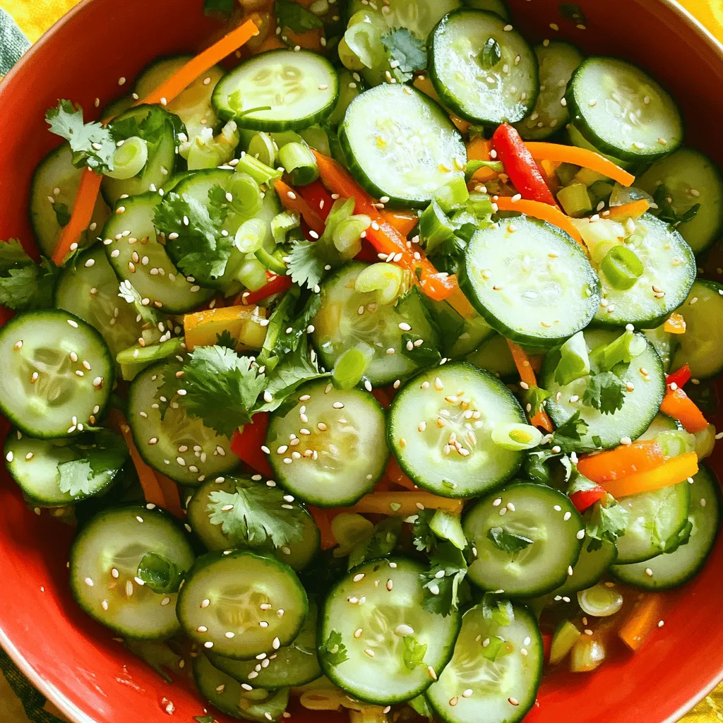 ![Choose firm cucumbers for the salad. Look for ones that are dark green. I prefer English cucumbers. They are long and have fewer seeds. You can also use Persian cucumbers. They are smaller and very crunchy. Wash them well before slicing. You will need a few more veggies to make this salad shine. Carrots add color and sweetness. Slice them into thin matchsticks, called julienne. Red bell peppers give a nice crunch and a pop of color. Green onions add a mild onion flavor. Lastly, fresh cilantro adds a bright taste. You can leave it out if you don’t like it. The dressing is simple but full of flavor. You will need rice vinegar, soy sauce, and sesame oil. These give the salad a tangy and savory kick. You also add sugar for a hint of sweetness. Chili flakes add heat, but you can adjust the amount. Don’t forget to toss in a little salt to enhance the flavors. For the full recipe, check out the details above! Start by washing the cucumbers well. Use two large cucumbers. Next, thinly slice them. You want nice, round pieces. Then, take one carrot and julienne it. This means cutting it into thin strips. Now, slice one red bell pepper into thin pieces. It adds color and crunch. Finally, chop three green onions and roughly chop a quarter cup of fresh cilantro. Mix all these veggies in a large bowl. In a small bowl, whisk together the dressing. Use three tablespoons of rice vinegar for tanginess. Add two tablespoons of soy sauce for some saltiness. Pour in one tablespoon of sesame oil for a nutty flavor. Then, add one teaspoon of sugar to balance it out. If you like spice, add half a teaspoon of chili flakes. Stir until the sugar dissolves completely. Now, pour the dressing over the mixed veggies. Toss gently to coat everything. Make sure all the vegetables get some dressing. Let the salad sit at room temperature for 15-20 minutes. This helps the flavors mix well. Just before serving, sprinkle toasted sesame seeds on top. Give it another light toss. Your Asian cucumber salad is now ready to enjoy! For a full recipe, check out the detailed instructions above. To boost the taste of your salad, consider adding fresh herbs. Mint and basil add bright notes. You can also mix in some garlic or ginger for extra depth. Adding a splash of lime juice gives it a fresh twist. Adjust the chili flakes based on your heat level. More chili means more kick! This salad pairs well with grilled meats or fish. Serve it as a side dish at barbecues. You can also use it as a filling in wraps or on rice bowls. It's great for summer picnics or potlucks. You can even serve it as a light lunch topped with protein. Serve the salad in a clear bowl to show off its colors. Use large, vibrant bowls or plates for impact. Garnish with extra cilantro and toasted sesame seeds. A sprinkle of chili flakes adds color and spice. These small touches make your dish look gourmet. For a fun twist, consider using small jars for individual servings. Try these tips to make your Asian Cucumber Salad shine. Check out the Full Recipe for all the details! {{image_2}} You can make this salad heartier by adding proteins. Grilled chicken or shrimp pairs well with the crisp veggies. Tofu is a great option for a plant-based choice. Simply cube it and toss it in with the salad. Adding proteins not only boosts the taste but also adds nutrition. Feel free to switch up the dressing for your taste. You can use peanut sauce for a nutty flavor. A sweet soy dressing can add richness. For a tangy kick, try a lime vinaigrette. Each option will change the flavor and make the salad unique. Experiment with different dressings to find your favorite! Using seasonal ingredients can elevate your salad. In summer, add fresh radishes or sliced mango for a sweet twist. In fall, try adding thin apple slices for crunch. You can also include fresh herbs like mint or basil for extra flavor. Seasonal ingredients keep your salad fresh and exciting. For the full recipe and more details, check out the complete guide to Crisp and Zesty Asian Cucumber Salad. To keep your Asian cucumber salad fresh, place it in an airtight container. This keeps air out and protects the salad from drying out. You should store it in the fridge. Glass or plastic containers work well. Avoid leaving it out at room temperature for too long, as it can spoil quickly. Your salad will last about 2 to 3 days in the fridge. After that, the cucumbers may become soggy. To enjoy it at its best, eat it within this time frame. If you notice any off smells or changes in texture, it's best to toss it. If you have leftover salad, you can repurpose it in various dishes. Toss it into a wrap for a crunchy bite. You can also add it to a rice bowl or mix it into a stir-fry for extra flavor. Just remember, the fresher the ingredients, the better the taste! For the full recipe, check out the details above. Yes, you can use different types of cucumbers. English cucumbers are great. They are long and have fewer seeds. Persian cucumbers work well too. They are small and very crunchy. You can even use pickling cucumbers if you want a more tangy taste. Just remember to slice them thinly for the best texture. To make your salad less spicy, simply reduce the chili flakes. Start with a pinch and taste. You can also skip them altogether if you prefer no heat. Adding a bit more sugar can balance the flavors too. If you like, you can mix in some extra veggies like bell peppers, which add sweetness. Yes, you can prepare the salad ahead of time. Just keep the dressing separate until you are ready to serve. Mix the vegetables and store them in the fridge. When you want to eat, pour the dressing over and toss. This keeps the salad crisp and fresh. For the best taste, serve within a day or two. Check the [Full Recipe] for more tips on prep time! In this post, we explored cucumbers, fresh veggies, and delicious dressings. You learned how to prepare, mix, and enhance your salad's flavor. I shared tips for serving and storing your dish. Variat