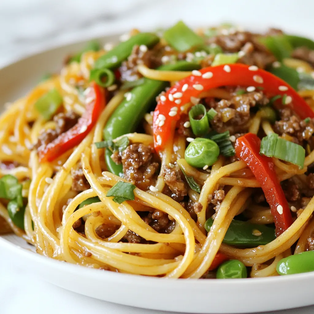 A delicious fusion of Asian flavors and classic spaghetti, featuring ground beef and fresh vegetables.