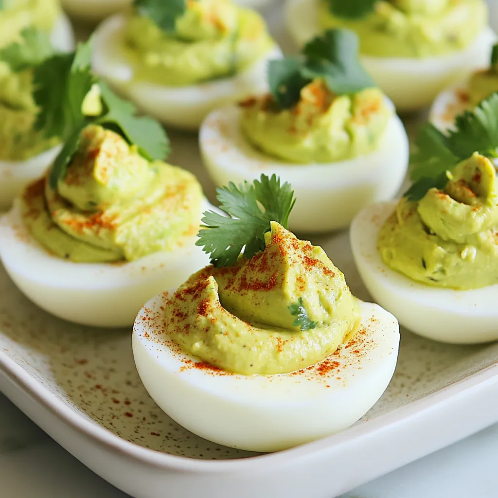 - 6 large eggs - 1 ripe avocado - 2 tablespoons Greek yogurt - 1 tablespoon Dijon mustard - 1 teaspoon lime juice - 1/4 teaspoon garlic powder - 1/4 teaspoon smoked paprika - Salt and pepper to taste - Fresh cilantro When I make avocado deviled eggs, I focus on fresh, simple ingredients. The large eggs form the base and provide protein. I love using ripe avocados for smoothness and flavor. Greek yogurt adds creaminess and a bit of tang. For seasoning, Dijon mustard gives a nice kick. Lime juice brightens the dish. Garlic powder adds depth, and smoked paprika brings warmth. Salt and pepper enhance all the flavors. Finally, fresh cilantro makes a beautiful garnish. It adds color and a hint of herbiness. This combination creates a tasty and healthy snack that everyone loves. {{ingredient_image_1}} Start by placing your eggs in a saucepan. Cover them with cold water. Make sure the water is about an inch above the eggs. Turn the heat to medium and bring it to a boil. Once boiling, cover the saucepan and turn off the heat. Let the eggs sit for 10-12 minutes. After the time is up, carefully move the eggs to a bowl of ice water. Let them cool for about 5 minutes. This step helps make peeling easier. Once cooled, gently tap each egg on the counter. Peel the eggs carefully, removing the shell completely. Slice each egg in half lengthwise. Place the yolks into a mixing bowl and set the egg whites aside on a serving platter. To the bowl, add one ripe avocado, Greek yogurt, Dijon mustard, lime juice, salt, pepper, garlic powder, and smoked paprika. Mash everything together until it is smooth and creamy. You can use a fork or a potato masher for this. Now, it's time to fill the egg whites with your creamy avocado mixture. You can use a piping bag for a fancy look or a spoon for a quick fill. Finally, garnish with a sprinkle of smoked paprika and a small sprig of fresh cilantro for a nice touch. Enjoy your delicious avocado deviled eggs! To make perfect hard-boiled eggs, time is key. Start by placing the eggs in a pot. Cover them with cold water, about an inch above the eggs. Heat the pot over medium. Once the water boils, cover the pot and turn off the heat. Let the eggs sit for 10 to 12 minutes. This method prevents overcooking and keeps the yolks bright yellow. Next, cooling is crucial. After the time is up, move the eggs into a bowl of ice water. Let them chill for about 5 minutes. This step makes peeling easier. It also stops the cooking process, ensuring a creamy yolk. To make a creamy filling, Greek yogurt adds richness. If you don’t have Greek yogurt, you can use sour cream or even mayonnaise. Both will work well and add their own flavor. For the best texture, mash the yolks and avocado together. Use a fork to break them apart first. Then, mix in the yogurt and other ingredients until smooth. Ensure there are no lumps. A smooth filling will look better and taste great. Garnishing your deviled eggs adds flair. Try a sprinkle of smoked paprika for color and flavor. You can also add a tiny sprig of fresh cilantro on top. It adds a fresh touch. If you want to mix it up, consider using other herbs. Chives or dill can offer different flavors. Get creative with your presentation to impress your guests! Pro Tips Use Fresh Avocado: Ensure your avocado is perfectly ripe for the creamiest filling. A ripe avocado will be slightly soft to the touch but not mushy. Chill the Eggs: After boiling, cooling the eggs in ice water not only makes peeling easier but also helps to prevent the yolks from turning gray. Experiment with Flavors: Feel free to customize your filling by adding ingredients like sriracha for heat or finely chopped pickles for a tangy twist. Presentation Matters: For a stunning presentation, use a piping bag to fill the egg whites and garnish with additional herbs or spices. {{image_2}} To add a kick to your avocado deviled eggs, you can make them spicy. Diced jalapeños bring heat and flavor. You can also use hot sauce for an extra zing. Just mix in a teaspoon or two, and taste as you go. This adds a fun twist to the dish and wakes up your taste buds. For a Mediterranean flair, try adding feta cheese or olives. Crumbled feta gives a creamy, salty taste. Chop up some olives for a briny punch. Mix these ingredients with your avocado filling. This twist combines rich flavors and makes the dish more exciting. If you want a vegan version, it’s simple! Use plant-based yogurt instead of Greek yogurt. This keeps the creaminess without the dairy. You can even replace the eggs entirely! Just make a filling using mashed avocado and yogurt. This option is great for anyone avoiding animal products. To keep your avocado deviled eggs fresh, store them right. Place any leftovers in an airtight container. If you have leftovers, cover them well to prevent drying out. It’s best to eat them within two days for the best flavor and texture. You cannot freeze avocado deviled eggs. Freezing changes the texture of the avocado and eggs. This makes them watery and unappetizing. It’s best to enjoy them fresh. Eat your avocado deviled eggs within three days for peak freshness. After that, they may lose their creamy texture. If they look or smell off, it’s best to toss them out. Freshness is key for this tasty snack. To hard-boil eggs, place them in a saucepan. Cover them with cold water. Bring the water to a boil over medium heat. Once it boils, cover the saucepan and turn off the heat. Let the eggs sit for 10 to 12 minutes. This method gives you firm yolks without a green ring. After cooking, cool the eggs quickly in ice water for easy peeling. Yes, you can use any type of avocado. Hass avocados are popular due to their creamy texture. Other varieties, like Fuerte, also work well. Just ensure they are ripe. Ripe avocados blend smoothly, giving you the best flavor and texture. Avocado deviled eggs last about three days in the fridge if stored properly. Keep them in an airtight container to maintain freshness. Ho
