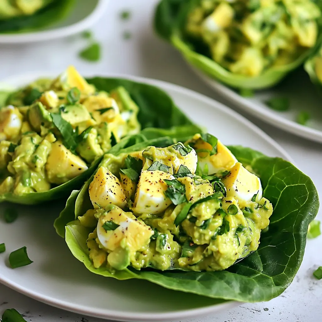 A fresh and creamy egg salad wrapped in crisp lettuce leaves, perfect for a light meal or snack.