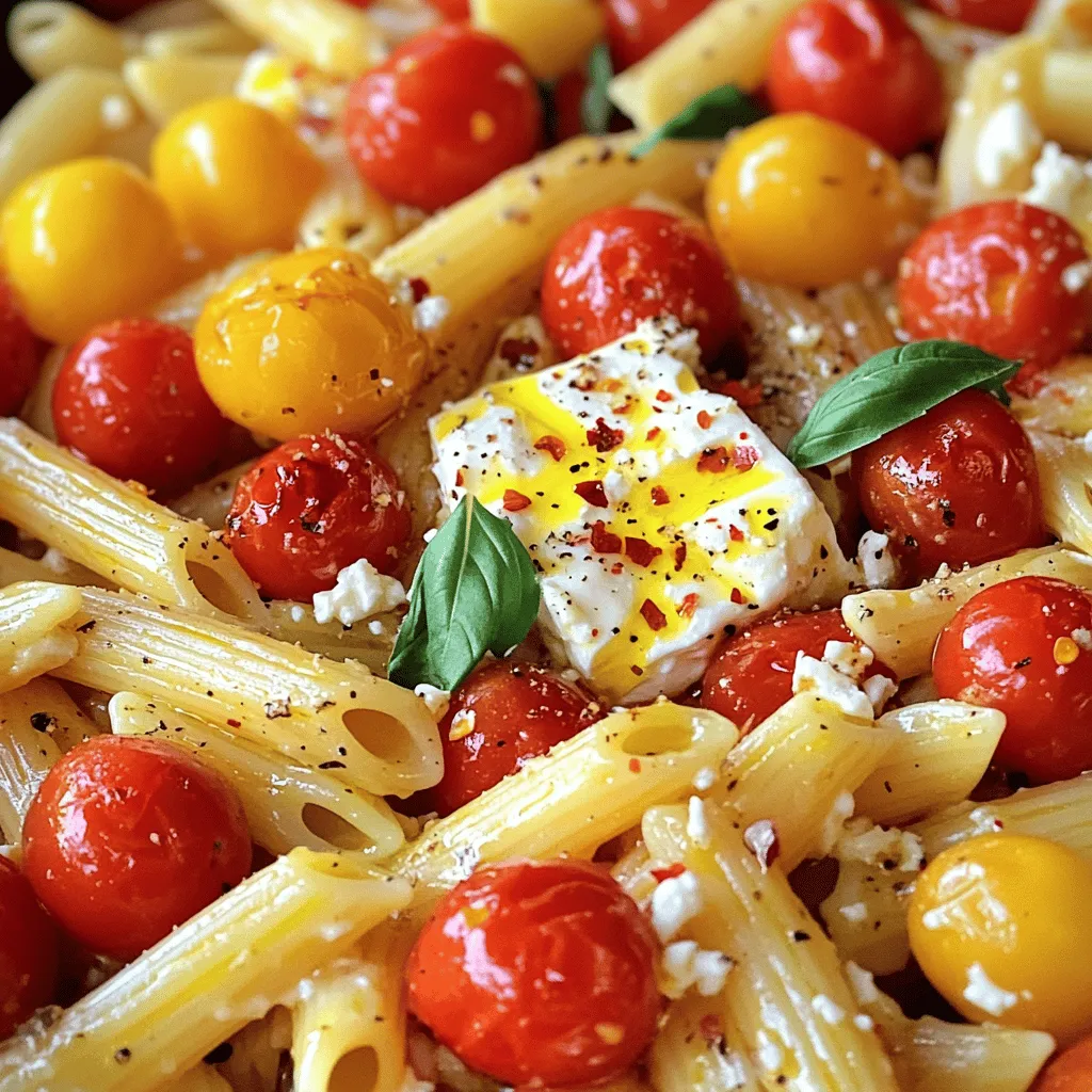 - Feta cheese: This cheese is the star of the dish. It melts into a creamy sauce. Feta adds a tangy flavor that balances the sweetness of tomatoes. - Pasta varieties (penne or fusilli): You can use penne or fusilli for this recipe. Both shapes hold the sauce well, ensuring every bite is flavorful. The pasta gives the dish substance and makes it filling. - Cherry tomatoes and garlic: These two ingredients bring freshness and aroma. Cherry tomatoes burst in the oven, adding sweetness. Garlic adds a rich, savory flavor that enhances the overall taste. - Olive oil and herbs: Olive oil helps to cook the tomatoes and feta. It adds richness and helps other flavors blend. Dried oregano adds an earthy taste that complements the dish nicely. - Optional ingredients like red pepper flakes: If you enjoy spice, red pepper flakes are a great addition. They add heat without overpowering the flavors of the other ingredients. - Fresh basil and Parmesan cheese: Garnishing with fresh basil adds a pop of color and freshness. Grated Parmesan cheese adds more flavor and creaminess, making the dish even more delightful. For the complete recipe, check out Baked Feta Pasta Delight. 1. First, preheat your oven to 400°F (200°C). This step gets your oven ready for baking. 2. In a large baking dish, combine 2 cups of halved cherry tomatoes and 4 minced cloves of garlic. This mix will bring great flavor. 3. Drizzle 1/4 cup of olive oil over the tomatoes and garlic. Sprinkle in 1 teaspoon of dried oregano, red pepper flakes, salt, and pepper. Toss everything well to coat. 4. Next, place 200g of feta cheese in the center of the tomato mix. This cheese will melt perfectly. 5. Drizzle a bit more olive oil over the feta. Season it with salt and pepper. The feta needs love too! 6. Now, bake the dish in your preheated oven for about 30 minutes. Look for the tomatoes to burst and the feta to turn soft and golden. 7. While the feta and tomatoes bake, bring a large pot of salted water to a boil. Add 300g of pasta, penne or fusilli works best. Cook according to package instructions until it is al dente. Drain the pasta and set it aside. 8. When the feta and tomatoes are done, use a fork to gently mash the feta into the tomatoes. This creates a creamy sauce. 9. Add the cooked pasta to the baking dish. Toss everything together until the pasta is well coated in the sauce. If it seems dry, add a splash of pasta water. You can find the full recipe for this delicious dish above! To know when feta is properly baked, look for a golden crust on top. The cheese should be soft and slightly melted. If it’s too firm, it may need more time. Avoid overcooked pasta by checking it a minute before the package time ends. You want it al dente, which means it should have a slight bite. This will help it hold up in the sauce. You can customize seasoning levels to fit your taste. If you like more spice, add extra red pepper flakes. For a milder flavor, reduce the amount you use. Using fresh herbs adds a vibrant touch. Chop fresh basil and stir it in at the end. This gives a bright flavor that pairs well with the creamy feta. For baking, a medium-sized baking dish works best. It should be deep enough to hold the pasta and sauce. Essential utensils for pasta cooking include a large pot and a colander. The pot needs to hold enough water for the pasta. A good colander lets you drain it easily without losing any pieces. Check out the Full Recipe for more details on making this dish! {{image_2}} If you want to make this dish vegan, use a plant-based feta. It melts well and still gives a creamy texture. Look for brands made from nuts or tofu that mimic feta's flavor. For pasta, you can switch to gluten-free options like brown rice or chickpea pasta. They work great and keep the meal delicious. You can also try whole wheat pasta for a healthy twist. Adding more veggies can boost flavor and nutrition. Spinach is a great choice. It wilts well and adds a nice green touch. Zucchini is another fun option. Slice it thin and mix it in for added texture. For protein, think about chicken or shrimp. Both cook quickly and soak up the sauce's flavor. Cook them separately, then mix them in with the pasta for a heartier meal. To give your dish a Mediterranean flair, add olives or sun-dried tomatoes. These ingredients bring salty and tangy notes. You can also sprinkle in some capers for a nice bite. If you like spicy food, try adding more red pepper flakes or even jalapeños. They will kick up the heat and make every bite exciting. For a savory touch, consider adding smoked paprika or anchovies for depth. Remember, these variations can make your Baked Feta Pasta even more fun and tasty. Check the full recipe for the base and experiment with these ideas! To store leftovers, let your Baked Feta Pasta cool down first. Place it in an airtight container. I like to use glass containers to keep it fresh. You can keep it in the fridge for up to three days. When you’re ready to enjoy it again, reheat it on the stove or in the microwave. For the best results, add a splash of water or olive oil when reheating. This helps keep the pasta moist and delicious. Heat it on low to avoid overcooking. Stir it gently to mix the sauce back in. Can you freeze Baked Feta Pasta? Yes, you can! Freezing is a great way to save leftovers. Make sure it cools completely before packing it. Use a freezer-safe container or heavy-duty freezer bags. It can last up to two months in the freezer. When you're ready to eat it, thaw it in the fridge overnight. For reheating, place it in a baking dish and add a bit of water or olive oil. Cover it with foil to keep it from drying out. Heat it at 350°F (175°C) until it's warm all the way through. Enjoy your tasty meal again! Baked Feta Pasta is a simple dish that combines baked feta cheese with pasta. This dish became popular on social media, where many shared their own versions. It started in Finland and quickly spread across the world. The feta melts into a 