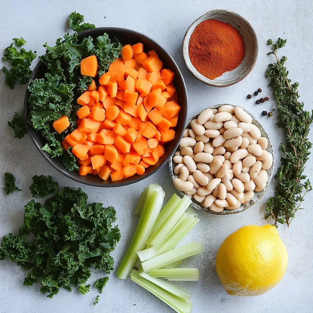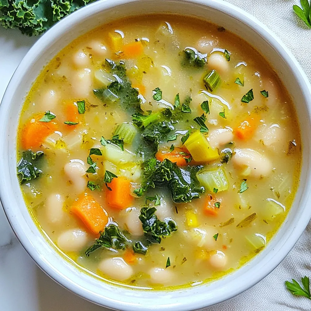 A comforting and nutritious soup made with white beans, vegetables, and kale, perfect for a hearty meal.