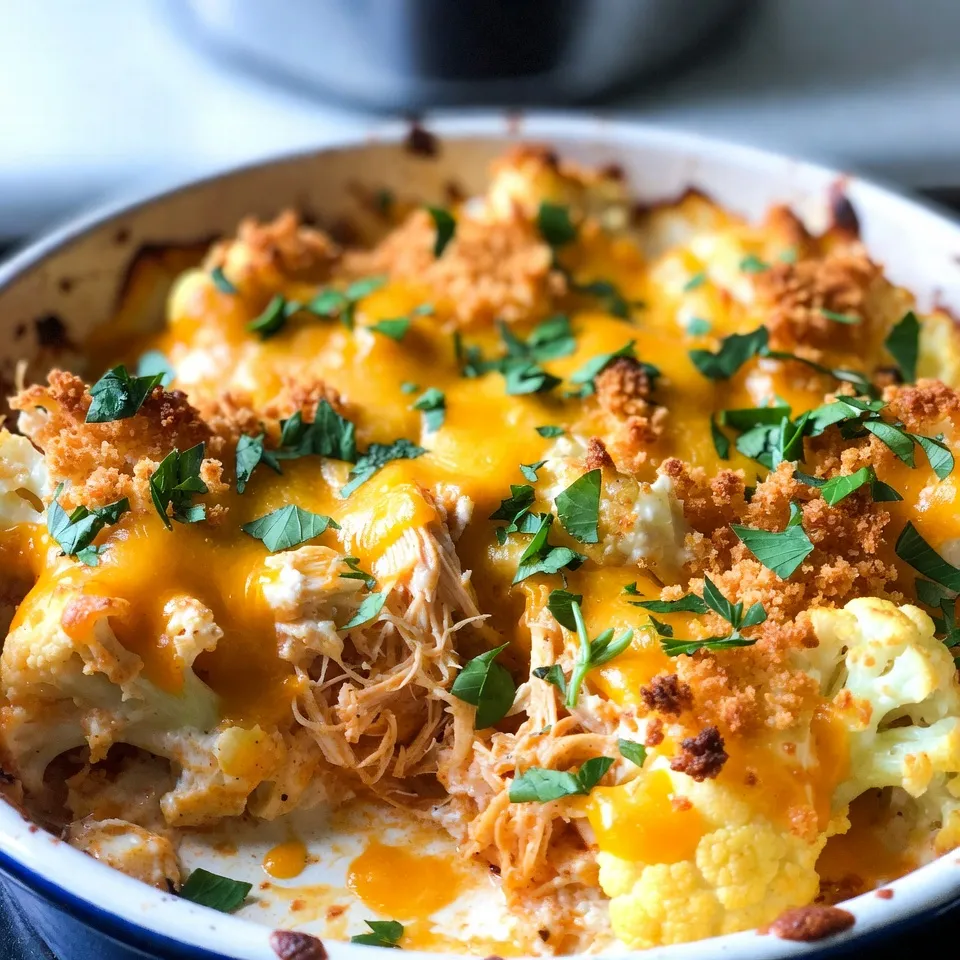 A spicy and creamy casserole featuring cauliflower and shredded chicken, topped with cheese and breadcrumbs.