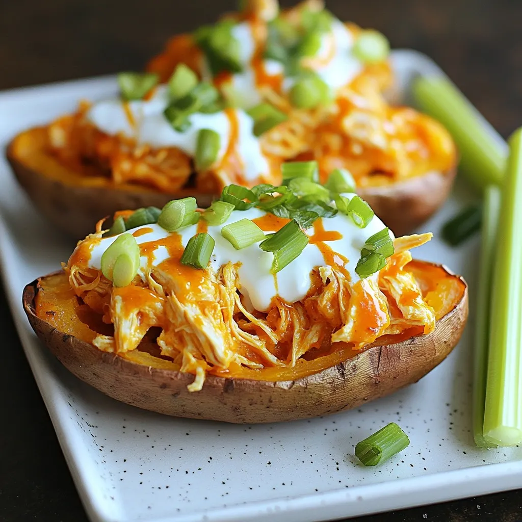 For a beautiful dish, serve the stuffed sweet potatoes on a platter. Garnish them with sliced green onions. Add celery sticks on the side for some crunch. A drizzle of extra buffalo sauce gives a nice touch too. This makes your dish pop and look inviting.