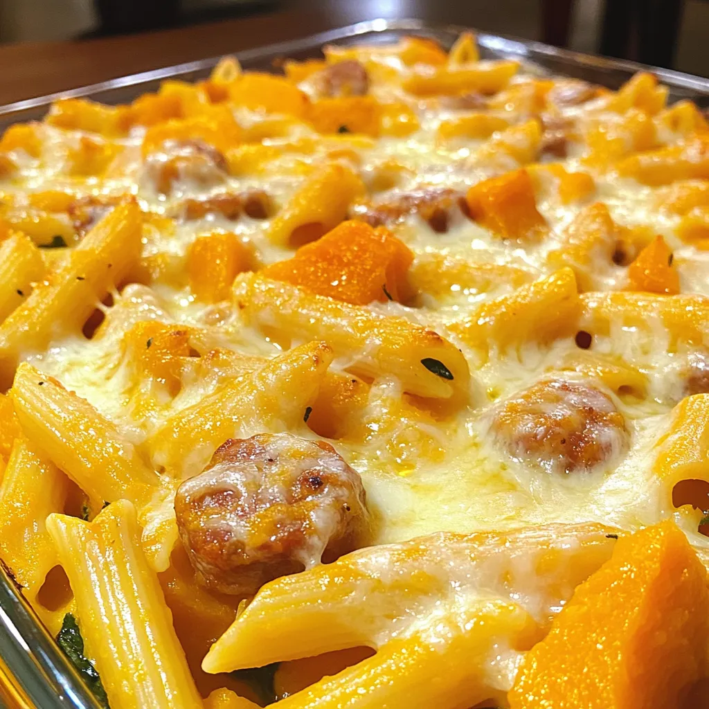 - 2 cups butternut squash, peeled and diced - 1 pound Italian sausage (mild or spicy) - 12 ounces penne pasta - 1 small onion, finely chopped - 3 cloves garlic, minced - 1 teaspoon dried thyme - 1 teaspoon dried oregano - 1 cup ricotta cheese - 2 cups shredded mozzarella cheese - 1 cup grated Parmesan cheese - 2 cups spinach, roughly chopped - 3 cups chicken broth - 2 tablespoons olive oil - Salt and pepper to taste Butternut squash is sweet and creamy, making it a great base. The Italian sausage adds a savory depth. You can choose mild or spicy sausage based on your taste. Penne pasta holds the sauce well and gives a nice bite. Chop the onion and garlic finely for a smooth blend. Dried thyme and oregano enhance the flavors and add a bit of earthiness. Ricotta cheese provides a creamy texture, while mozzarella and Parmesan give a golden, bubbly topping. Spinach adds color and nutrition. Using chicken broth instead of water boosts the flavor. Olive oil is key for sautéing the onion and garlic. Don’t forget salt and pepper to taste; they bring all the flavors together. Gather these ingredients to make a cozy, delicious meal. This dish is easy to prepare and comforting to eat. You will love how well everything comes together in this pasta bake. - Preheat your oven to 375°F (190°C). - In a large pot, boil salted water. Add penne pasta and cook for 6-7 minutes until al dente. Drain and set aside. - Heat olive oil in a large skillet over medium heat. - Add chopped onion and sauté until soft, about 5 minutes. - Stir in minced garlic and cook for 1 more minute. - Add Italian sausage to the skillet. Break it up with a spoon and cook until browned, about 8-10 minutes. - Once the sausage is done, add diced butternut squash along with dried thyme and oregano. Mix well and cook for 5-7 minutes until squash softens. - Pour in chicken broth and bring the mix to a simmer. - Add chopped spinach and cook for 2-3 minutes until wilted. - In a bowl, combine ricotta cheese, half of the mozzarella, and half of the Parmesan. Mix until smooth. - In a large baking dish, combine cooked penne pasta with the sausage and squash mix. Fold in the ricotta mixture until well coated. - Top the pasta bake with remaining mozzarella and Parmesan cheese. - Cover with aluminum foil and bake for 25 minutes. - Remove foil and bake for another 15 minutes until cheese is golden and bubbly. - Let the dish cool for a few minutes before serving. Sautéing the onion and garlic is key. This step adds deep flavor to your dish. Start with medium heat and stir often. You want the onion to soften and turn clear. This usually takes about five minutes. To get that perfect cheese melt, layer your cheeses wisely. Use both mozzarella and Parmesan. Add the mozzarella on top for a stretchy melt. The Parmesan will give a nice golden crust. Keep an eye on it while baking. You want it bubbly and slightly browned. For side dishes, a simple green salad works best. The freshness of the greens balances the richness of the pasta bake. You can also serve crusty bread. It’s great for soaking up any sauce left on your plate. Garnish the dish with fresh herbs. Chopped parsley or basil adds a pop of color and flavor. A sprinkle of red pepper flakes gives a nice kick, too. This will make your dish look even more inviting. For a vegetarian twist, swap out the sausage for lentils or mushrooms. Both options add great texture and flavor. You can also use plant-based sausage if you prefer. To make a gluten-free version, choose gluten-free pasta. Check the labels on your broth and cheeses to ensure they're gluten-free, too. This way, everyone can enjoy this tasty dish without worry. {{image_2}} You can easily swap out the sausage in this dish. Try using chicken or turkey for a lighter option. Both proteins will still give you great flavor. For cheese, mix it up! Use sharp cheddar for a tangy bite. Gouda will add a nice smokiness. If you prefer a creamier texture, go for a blend of cream cheese and mozzarella. Each choice creates a unique taste and texture. This pasta bake shines with seasonal veggies. In fall, butternut squash is perfect. In spring, add fresh asparagus or peas for a bright touch. Summer is great for zucchini or cherry tomatoes. Adjusting the dish for different seasons keeps it fresh. In winter, add kale for extra nutrients. Each season brings new flavors, making this dish versatile and fun. To keep your Butternut Squash Sausage Pasta Bake fresh, store it in airtight containers. Place the leftovers in the fridge. They will last for about 4 to 5 days. Make sure to cool the dish to room temperature before sealing. For long-term storage, you can freeze it. Just wrap the dish tightly in plastic wrap and foil. It can last up to 3 months in the freezer. Label the container with the date. This helps you keep track of freshness. To reheat your pasta bake, the oven is the best method. Preheat it to 350°F (175°C). Place the pasta bake in an oven-safe dish. Cover it with foil to keep moisture in. Bake for about 20 minutes or until hot. If you use a microwave, make sure to use a microwave-safe plate. Heat in short bursts of 1 to 2 minutes. Stir in between to ensure it heats evenly. Both methods work well, but the oven gives the best texture. You can make this dish healthier by using some simple swaps. Here are a few ideas: - Use turkey sausage instead of Italian sausage to cut fat and calories. - Replace ricotta cheese with low-fat or cottage cheese for a lighter option. - Add more veggies like zucchini or bell peppers to boost nutrients. - Opt for whole grain penne pasta for more fiber and nutrients. - Reduce cheese by using less mozzarella and Parmesan on top. These changes keep the flavor while making it healthier. Yes, you can make this dish ahead of time! Here’s how: - Prepare the dish up to the baking step. - Cover it tightly with foil and store it in the fridge for up to 24 hours. - When ready, bake it straight from the fridge. Just add an ext