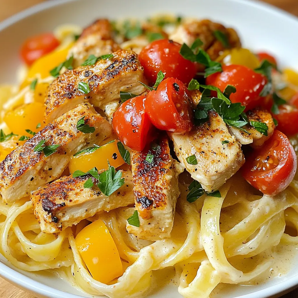 A creamy and spicy pasta dish featuring Cajun-seasoned chicken, bell peppers, and tomatoes.