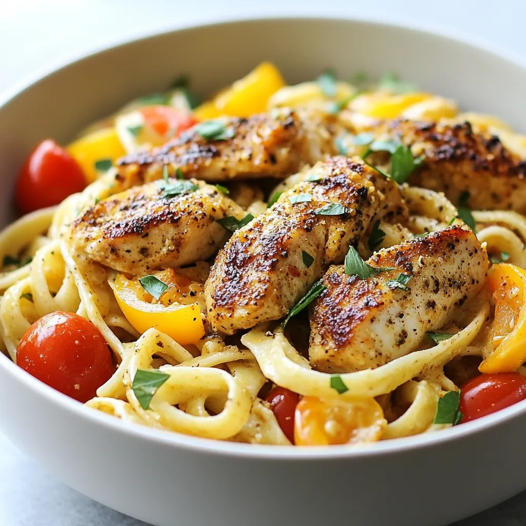 - 2 boneless, skinless chicken breasts - 8 ounces fettuccine pasta - 1 cup heavy cream - 2 tablespoons Cajun seasoning - 1 bell pepper (red or yellow) - 1 medium onion, diced - 3 cloves garlic, minced - 1 cup cherry tomatoes, halved - 1/2 cup grated Parmesan cheese - Olive oil, salt, and pepper When I make Cajun Chicken Pasta, I focus on fresh ingredients. The chicken should be boneless and skinless for quick cooking. Fettuccine pasta is my go-to because it pairs well with creamy sauces. Heavy cream adds richness, making every bite satisfying. The Cajun seasoning is key. It gives the dish its bold and spicy flavor. I love using a bright bell pepper for color and crunch. A medium onion adds sweetness and depth to the dish. Next, garlic and cherry tomatoes bring a burst of flavor. I always use fresh garlic because it enhances the taste. The grated Parmesan cheese adds a lovely creaminess and salty finish. Olive oil, salt, and pepper are simple but important. They help bring all the ingredients together. This combination makes for a hearty and flavorful meal in just 30 minutes. {{ingredient_image_1}} To cook the fettuccine, first, fill a large pot with salted water. Bring that water to a rolling boil. Add the fettuccine and let it cook for about 8 to 10 minutes. This will give you pasta that is al dente, or firm to the bite. Once done, save half a cup of the pasta water. Drain the pasta and set it aside. Take the sliced chicken breasts and put them in a bowl. Sprinkle the Cajun seasoning over the chicken. Toss it well to coat every piece evenly. Next, heat olive oil in a large skillet over medium-high heat. Add the seasoned chicken to the skillet. Sauté it for 5 to 7 minutes. Cook until the chicken is golden brown and cooked through. Once done, remove the chicken from the skillet and keep it aside. In the same skillet, add the diced onion and sliced bell pepper. Sauté these veggies for about 3 to 4 minutes. You want them to start softening. Now, add minced garlic and halved cherry tomatoes. Cook for another 2 minutes. This brings out a nice aroma. Pour in the heavy cream and stir well. Bring this mixture to a gentle simmer. Add the cooked chicken back into the skillet. Stir in the grated Parmesan cheese. Check the sauce for seasoning and add salt and pepper as needed. If the sauce feels too thick, add some reserved pasta water until you reach your desired consistency. Now, add the cooked fettuccine to the skillet. Toss everything together. Make sure the pasta is fully coated in that creamy sauce. For serving, dish out the pasta into bowls. Add a sprinkle of freshly chopped parsley on top. This gives a nice pop of color and flavor. Enjoy your tasty Cajun chicken pasta! To cook fettuccine just right, use a large pot. Fill it with water and add salt. Once the water boils, add the pasta. Cook it according to the package instructions. Check for al dente texture at the end of the time. The pasta should be firm, not mushy. If you bite into it, it should have a slight chew. Remember to save some pasta water before draining. This starchy water helps to thicken your sauce later. You can boost the Cajun flavor with a few extras. Try adding smoked paprika for a deeper taste. A pinch of cayenne pepper gives it more heat. If you like herbs, add thyme or oregano. Marinating the chicken for an hour in Cajun seasoning and olive oil makes a big difference. This quick step adds flavor throughout the meat. Getting the sauce just right is key. If you find it too thick, add reserved pasta water slowly. Stir and check the thickness as you go. If it’s too thin, simmer it longer. The cream needs time to thicken. For a richer flavor, consider adding more Parmesan cheese. This also helps with thickness and gives a nice taste. Pro Tips Use Fresh Ingredients: Fresh vegetables and herbs elevate the dish's flavor and presentation. Opt for ripe cherry tomatoes and vibrant bell peppers for the best results. Adjust Spice Levels: If you're sensitive to heat, start with less Cajun seasoning and add more as desired. You can always add spice, but it's hard to take it away! Cook Pasta Al Dente: Cooking the fettuccine until just al dente ensures it holds up well when tossed with the creamy sauce, preventing it from becoming mushy. Garnish for Presentation: Fresh parsley not only adds a pop of color but also a fresh flavor contrast. Don't skip this step for a beautifully presented dish! {{image_2}} You can switch out chicken for other proteins. Shrimp adds a nice twist. It cooks quickly and soaks up the flavors well. Sausage is another great choice. It gives a hearty taste to the dish. If you prefer a vegetarian option, use firm tofu or chickpeas. Both options work well with Cajun seasoning. Just make sure to sauté them until golden. Fettuccine is a classic choice, but you can try other pastas too. Penne or rigatoni holds the sauce nicely. Spaghetti is great if you want something lighter. Even gluten-free pasta works well in this dish. Just cook it according to package directions to ensure a perfect texture. Want to kick up the heat? Add sliced jalapeños or serrano peppers. They bring a fresh flavor and extra spice. You can also use hot sauce for a quick boost. Just stir it in with the cream. For a smoky touch, try adding chipotle in adobo sauce. It adds depth and richness to the dish. To keep your Cajun Chicken Pasta fresh, store it in an airtight container. This helps prevent the dish from drying out. Make sure to let it cool before sealing. The pasta stays good in the fridge for up to three days. When reheating, I recommend using the stove. Add a splash of water or cream to keep it moist. Heat it in a skillet over low heat. Stir often to ensure even warming. You can also use the microwave, but cover it to avoid splatters. Heat in short bursts, stirring in between. To freeze Cajun Chicken Pasta, first, let it cool completely. Use freezer-safe containers or bags. Remove as much air as possible to avoid freezer burn. It can 