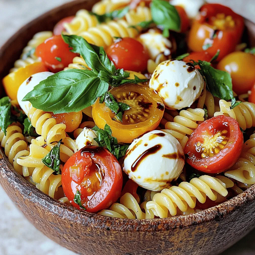 ![- 8 oz. fusilli pasta - 2 cups cherry tomatoes, halved - 1 cup fresh mozzarella balls (bocconcini) - 1 cup fresh basil leaves, torn - 3 tablespoons extra-virgin olive oil - 1 tablespoon balsamic glaze - 2 cloves garlic, minced - Salt and pepper to taste - 1 teaspoon dried oregano - Additional vegetables (e.g., bell peppers, cucumbers) - Protein options (e.g., grilled chicken or shrimp) To make a great Caprese Pasta Salad, you need fresh and simple ingredients. The fusilli pasta serves as a perfect base. It holds the dressing and adds a nice texture. Cherry tomatoes bring sweetness and color. Fresh mozzarella balls add creaminess. Basil leaves give that classic Caprese flavor. You can also choose to add extra veggies. Bell peppers and cucumbers work well. If you want protein, consider grilled chicken or shrimp. These additions can make the salad more filling. Using high-quality olive oil and balsamic glaze is key. They enhance the taste and richness of the dish. Don't forget to season with salt, pepper, and oregano. These spices tie everything together. For the full recipe and detailed steps, check out the [Full Recipe]. Enjoy making this fresh and flavorful pasta salad! First, you need to boil the fusilli in salted water. Bring a large pot of water to a boil. Add salt to the water; it enhances the pasta's flavor. Then, add the fusilli. Cook it until it is al dente, following the package instructions. Once done, drain the pasta. Rinse it under cold water to stop the cooking process. This helps keep the pasta firm. Next, it’s time to mix the pasta with the other fresh ingredients. In a large mixing bowl, combine the cooled fusilli, halved cherry tomatoes, fresh mozzarella balls, and torn basil leaves. The colors will look bright and inviting. Make sure to mix gently so you don’t break the mozzarella. Now, let’s prepare the dressing. In a small bowl, whisk together the olive oil, balsamic glaze, minced garlic, dried oregano, salt, and pepper. Whisking helps blend all the flavors. Make sure the mixture is smooth and well combined. Pour the dressing over the pasta mixture. Gently toss everything together until the pasta and veggies are evenly coated. Taste it, and adjust the seasoning as needed. If you like, add more salt or pepper. Cover the bowl with plastic wrap and refrigerate for at least 30 minutes. This allows the flavors to come together beautifully. When ready to serve, give the salad another gentle toss. Enjoy this vibrant dish! For the complete recipe, check out the Full Recipe. To make your Caprese pasta salad just right, avoid overcooking the pasta. Cook it until it is al dente. This means it should be firm to the bite. Overcooked pasta turns mushy and ruins the dish. After cooking, rinse the pasta in cold water. This helps stop the cooking process and keeps the pasta fresh. Next, use cold ingredients to enhance freshness. Cold cherry tomatoes and mozzarella balls keep the salad crisp and tasty. Fresh basil also shines when it is cold. This makes each bite burst with flavor. When it comes to flavor, salt and pepper are key. Start by adding a little salt and pepper. You can always add more later. A pinch of salt brings out the tomatoes’ sweetness. Fresh mozzarella also benefits from a sprinkle of salt. For the dressing, balance the olive oil and balsamic glaze to your taste. If you like it tangy, add more balsamic. If you prefer a smoother taste, add more olive oil. This dressing ties all the flavors together. Taste before serving and adjust as needed. Presentation matters! To make your salad look great, garnish with fresh basil leaves. You can also add a drizzle of balsamic glaze on top. This adds a nice touch and a hint of sweetness. Serve in a clear bowl to show off the colorful ingredients. For a fun twist, consider adding some sliced bell peppers or olives. These add color and extra flavor. You can find the full recipe in the article to explore more. Enjoy your delicious Caprese pasta salad! {{image_2}} You can change the vegetables based on the season. In summer, use sweet cherry tomatoes and fresh basil. In winter, swap in roasted bell peppers or spinach. These changes keep the salad fresh and tasty. Seasonal veggies add color and flavor. Try adding zucchini or asparagus in spring for a bright touch. If you want a vegan dish, use plant-based mozzarella. You can also choose gluten-free pasta made from rice or quinoa. This makes the salad friendly for more diets. Just ensure the other ingredients, like the balsamic glaze, are also vegan. Feel free to add your own twist! For an Italian flair, mix in some prosciutto or olives. You can also toss in sun-dried tomatoes for a richer taste. Each cultural twist brings a new flavor dimension. Experiment with herbs like oregano or thyme for extra depth. For a complete recipe, check out the Full Recipe for Caprese Pasta Salad. To store leftover Caprese Pasta Salad, follow these steps: - Place the salad in an airtight container. - Make sure it cools to room temperature first. - Seal the container tightly to keep air out. - Store it in the fridge. This will help keep it fresh. Caprese Pasta Salad will stay fresh for about 3 days in the fridge. After that, it may lose its flavor and texture. Check for any signs of spoilage before eating. If the tomatoes look mushy or the cheese smells off, it is best to throw it away. For the best taste, serve the salad cold. However, if you prefer it warm, here are some tips: - Heat it gently in a pan on low heat. - Add a splash of olive oil to keep it moist. - Stir often to avoid burning. You can also enjoy it at room temperature as a tasty option. To make Caprese Pasta Salad, follow these steps: 1. Cook 8 oz. of fusilli pasta in salted boiling water until al dente. 2. Drain and rinse the pasta under cold water to stop cooking. 3. In a large bowl, mix the cooked pasta with 2 cups of halved cherry tomatoes, 1 cup of fresh mozzarella balls, and 1 cup of torn fresh basil leaves. 4. In a small bowl