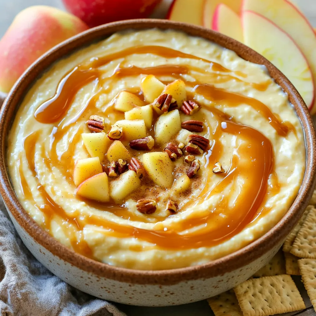 Use a nice bowl for serving the dip. Drizzle caramel on top for a pretty finish. Surround the bowl with apple slices and graham crackers. This makes it easy for guests to dip. You can also sprinkle some chopped pecans for a crunchy look.