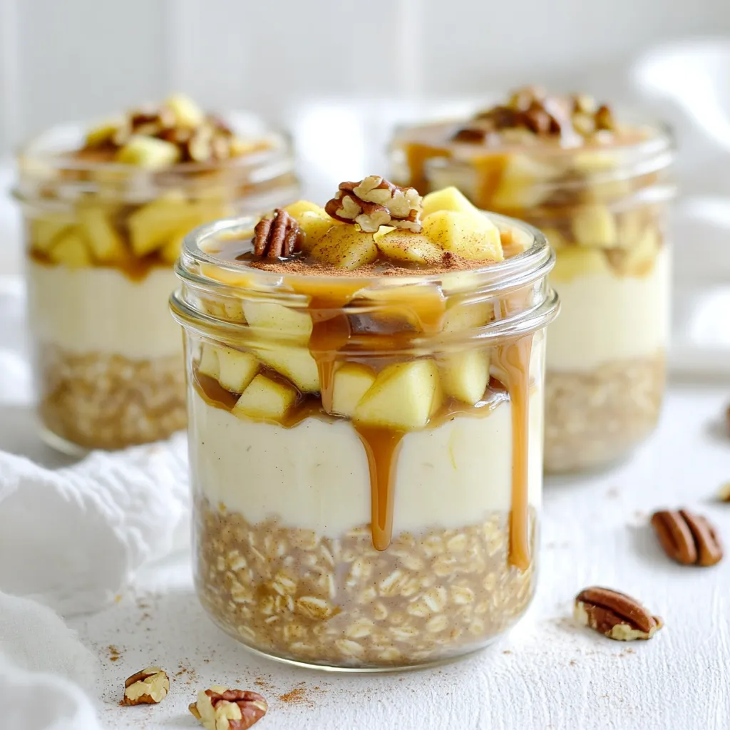 In the morning, take out your jars and give the oats a good stir. Top with a drizzle of caramel sauce for extra sweetness. Add a sprinkle of chopped nuts like pecans or walnuts for crunch. For a nice touch, serve your oats in clear jars. This way, you can show off the beautiful layers and colors. You can even add extra apple slices on top for a lovely look!
