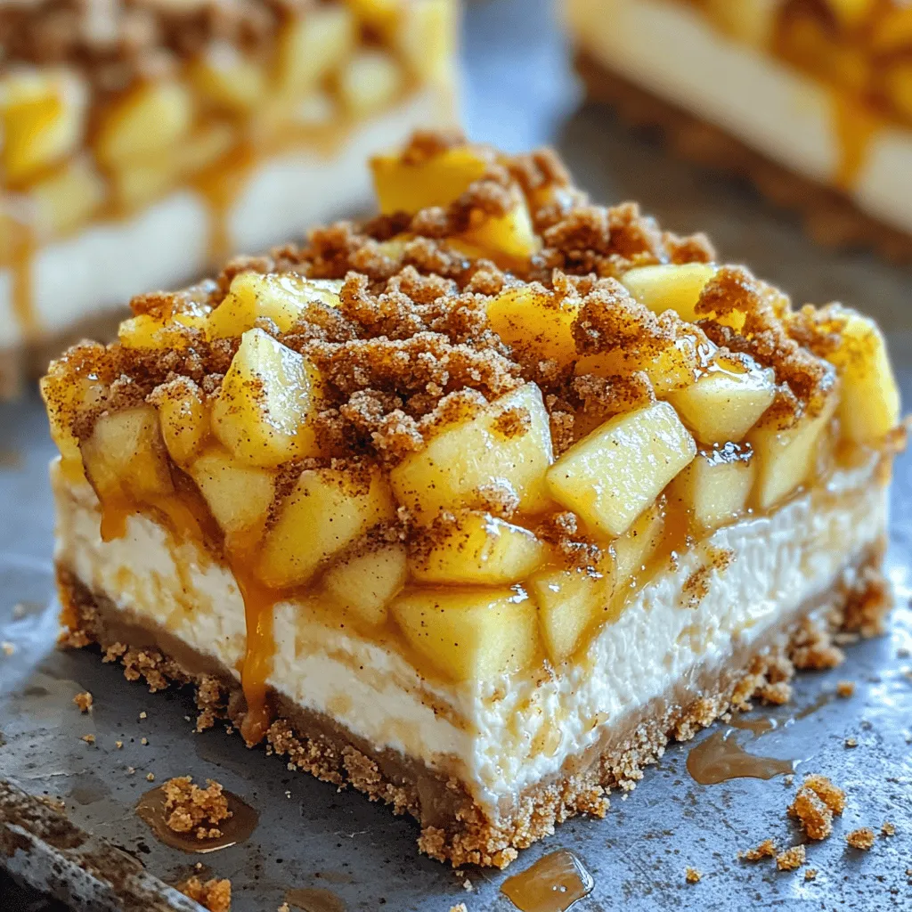 The crust of these bars is simple. I mix graham cracker crumbs, butter, and sugar. This creates a sweet base. The cheesecake filling is rich and creamy. I blend cream cheese with sugar, then add eggs. The apples and cinnamon add a nice touch. For the streusel topping, I combine flour, oats, brown sugar, and butter. This makes a crunchy layer on top. Finally, I drizzle caramel sauce over the finished bars. Each bite offers a mix of creamy, crunchy, and sweet flavors. These ingredients come together to make a delightful treat perfect for any occasion.