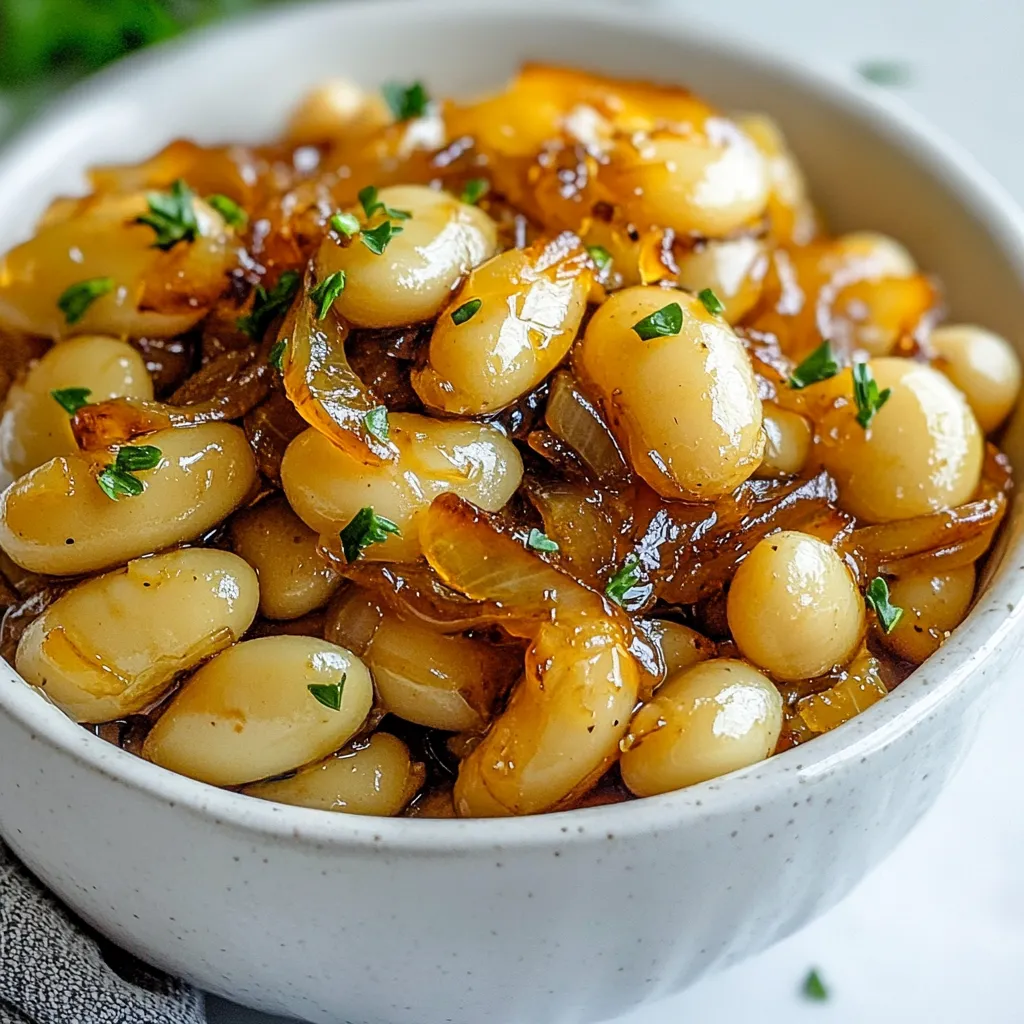 A delicious dish featuring caramelized onions and butter beans, perfect as a main course or side.