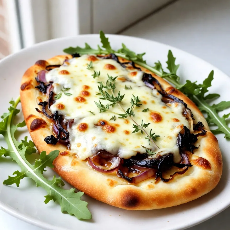 A delicious flatbread topped with caramelized onions and melted Gruyère cheese.