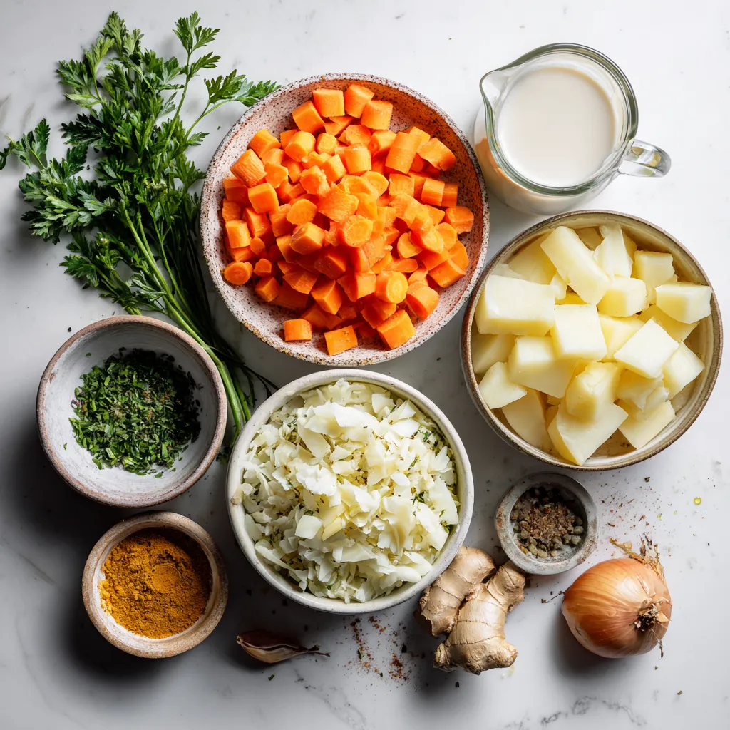 Start by gathering your ingredients. You need 4 medium carrots, 3 medium potatoes, 1 onion, and 3 cloves of garlic. Chop the carrots and onion. Peel and dice the potatoes. Mince the garlic. Grate 1 tablespoon of fresh ginger. This mix gives the soup its rich taste.