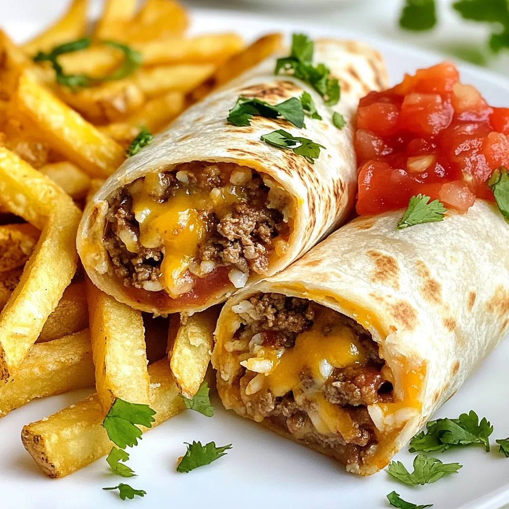 - 1 pound ground beef - 1 cup shredded sharp cheddar cheese - 1 cup refried beans - 1 cup cooked rice - ½ cup diced tomatoes - ½ cup diced onions - 2 cloves garlic, minced - 1 tablespoon taco seasoning - 4 large flour tortillas - 2 cups frozen French fries - 2 tablespoons olive oil - Salsa and sour cream When making Cheesy Beef Burritos, you need quality ingredients. Ground beef is the star. It adds flavor and protein. Sharp cheddar cheese gives the burritos a rich taste. Refried beans and rice create a hearty filling. Diced tomatoes, onions, and minced garlic add freshness. Taco seasoning brings that classic flavor we love. You can’t forget the flour tortillas. They wrap everything up nicely. Frozen French fries are the perfect side. A bit of olive oil helps cook them crispy. For serving, salsa and sour cream enhance the flavors. Don't skip these! With this list, you can create a tasty meal. Each ingredient plays a role, making your burritos a hit. {{ingredient_image_1}} - Preheat your oven for the frozen French fries. Check the package for the right temperature. - While it heats, chop the onions and mince the garlic. - Measure out the ground beef and have all your ingredients ready. - Heat olive oil in a large skillet over medium heat. - Add the chopped onions and minced garlic. Cook them until they smell great and look clear, about 2-3 minutes. - Next, add the ground beef to the skillet. Brown it for 5-7 minutes. Drain any extra fat. - Now, stir in the taco seasoning and diced tomatoes. Sprinkle in salt and pepper to taste. Mix it all well and cook for another 2-3 minutes. - In another bowl, mix the refried beans and cooked rice until they are combined. - Take a flour tortilla and lay it flat. Scoop about ⅓ cup of the beef mixture into the center. - Add a few spoonfuls of the bean and rice mix. Top it with some cheddar cheese. - Fold the sides of the tortilla in and roll it up tightly from the bottom. Repeat this for the other tortillas. - Place each burrito seam-side down on a baking sheet, and sprinkle any leftover cheese on top. - Bake the burritos in the preheated oven for about 10-15 minutes. They should be golden and crispy. - While the burritos bake, cook the frozen French fries according to the package instructions. - Once the burritos are ready, serve them hot with the crispy fries. - Garnish with fresh cilantro and serve with salsa and sour cream for dipping. - Choosing the right tortilla size: Use large flour tortillas. They hold more filling. A bigger tortilla makes it easier to wrap tightly. This helps keep the burrito intact while you eat. - Properly browning beef for flavor: Start with a hot skillet. Add olive oil, then the onions and garlic. Let them cook until they smell good. Next, add the ground beef. Brown it well for rich flavor. Drain any fat to keep it light. - Best dips and toppings: Salsa and sour cream are perfect. They add creaminess and spice. You can also use guacamole for a fresh taste. Chopped cilantro adds a nice touch, too. - Ideal sides to pair with burritos: Serve your burritos with crispy French fries. They add crunch and balance the meal. You can also try a side salad for freshness. A simple green salad works well. - Arranging burritos and fries on the plate: Place each burrito next to a generous pile of fries. This looks inviting and appetizing. Make sure the burrito is seam-side down for a neat look. - Using garnishes for visual appeal: Drizzle salsa over the burritos. This adds color and flavor. Top with chopped cilantro for a fresh pop. A sprinkle of cheese can also enhance the look. Pro Tips Use Fresh Ingredients: Fresh tomatoes and onions will enhance the flavor of your burritos significantly compared to canned options. Customize Your Fillings: Feel free to add or substitute with your favorite ingredients like bell peppers, jalapeños, or corn for extra texture and flavor. Don't Overstuff: While it’s tempting to fill your burritos, overstuffing may make them difficult to roll and could lead to spills during baking. Serve Hot: Burritos are best enjoyed hot out of the oven. Serve them immediately for a delightful experience! {{image_2}} You can swap ground beef for ground turkey or chicken. This change keeps the dish light and tasty. The flavor remains rich, and you still get that comforting burrito feel. For a vegetarian option, try using meat substitutes like lentils or black beans. These options bring a hearty texture and flavor without the meat. Want to spice things up? Add jalapeños or other peppers to the beef mixture. This addition gives a nice kick. You can also play with cheese types. Try pepper jack for a spicy twist, or go for a creamy queso for a different flavor. Mixing cheeses adds depth and makes each bite exciting. For a fun twist, serve burrito bowls instead of wrapped burritos. Layer crispy fries as the base, then pile on the beef and toppings. This style is great for sharing. You can also make wrap-style burritos. Add your favorite toppings like guacamole, sour cream, or fresh veggies for extra crunch. This way, everyone can customize their meal as they like. To keep your cheesy beef burritos fresh, wrap them tight in plastic wrap or foil. Store them in an airtight container in your fridge. This way, they stay tasty and safe. Burritos last about 3 to 4 days in the fridge. After that, they may lose flavor or texture. You can freeze both cooked and uncooked burritos. For cooked ones, let them cool first. Wrap them well in plastic wrap and then in foil. For uncooked burritos, you can freeze them after rolling. This keeps them fresh for up to 3 months. When it's time to eat, reheat cooked burritos in the oven at 350°F for about 20 minutes. If you freeze uncooked burritos, bake them straight from the freezer. Just add a few extra minutes to the cooking time. To maintain flavor and texture, let burritos cool before storing. This prevents sogginess. When reheating, cover them with foil to keep moisture in. Adding a sprinkl