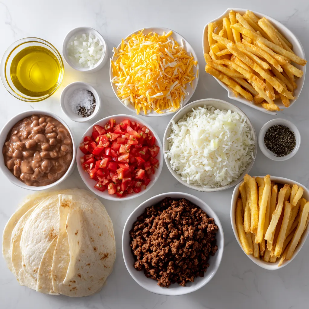 You can’t forget the flour tortillas. They wrap everything up nicely. Frozen French fries are the perfect side. A bit of olive oil helps cook them crispy. For serving, salsa and sour cream enhance the flavors. Don’t skip these!