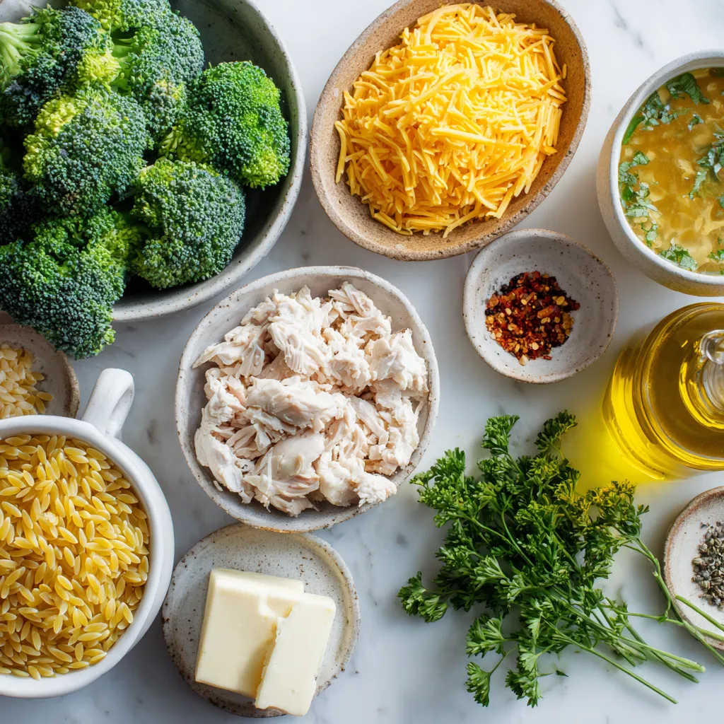 Gathering the right ingredients is key for this dish. Start with orzo pasta, a small rice-shaped pasta. Next, you need chicken broth. It adds flavor and moisture to the dish. Fresh broccoli florets bring color and nutrition. Use cooked chicken for quick prep. Shredded sharp cheddar cheese gives that creamy, cheesy taste. Cream cheese adds richness and smoothness.