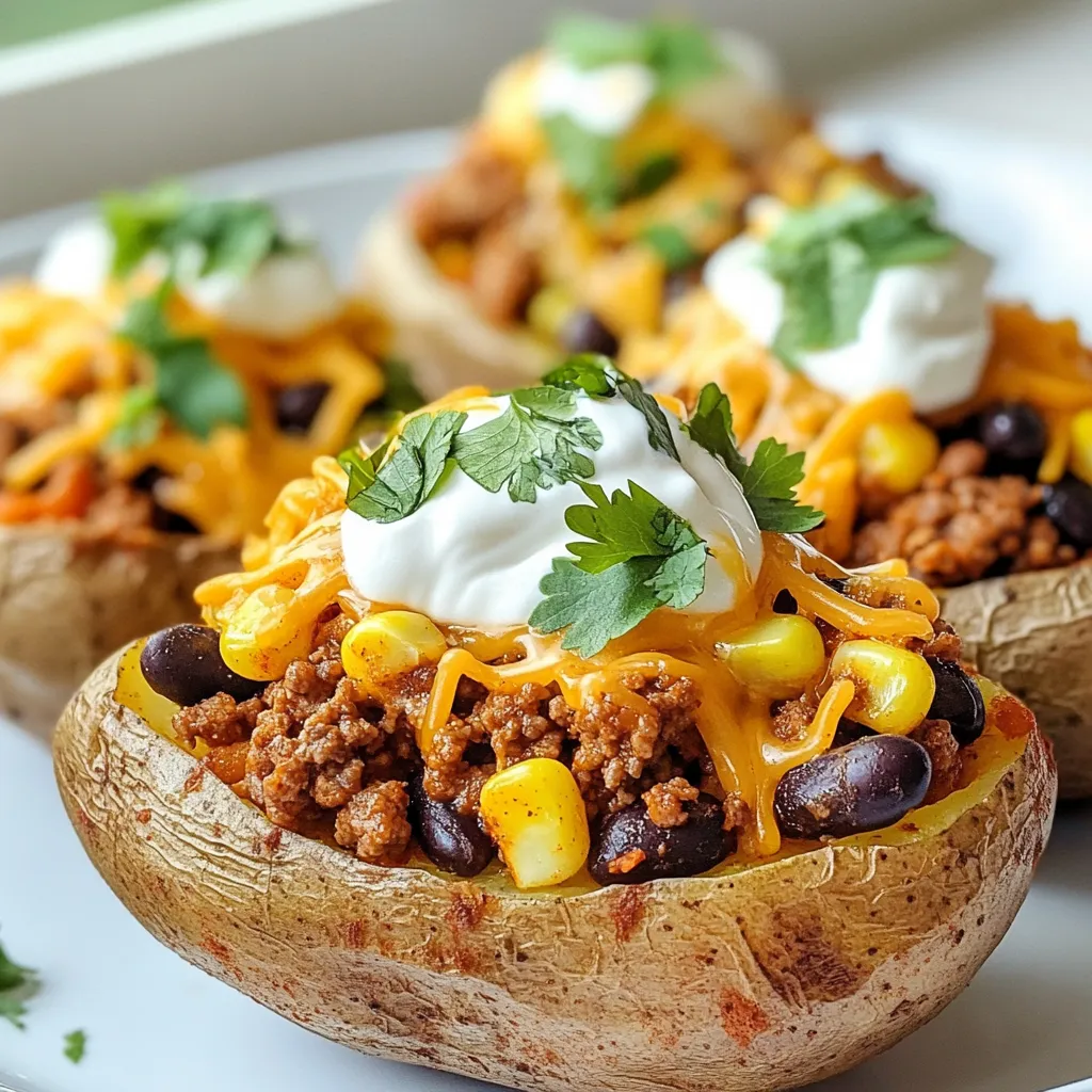 Delicious baked potatoes stuffed with a cheesy taco filling.