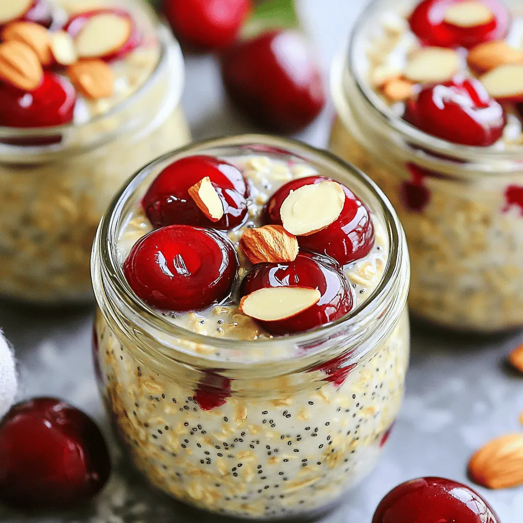 For this recipe, I always start with rolled oats. They soak well and create a great texture. Almond milk adds a creamy touch, but feel free to use any milk you prefer. Fresh cherries bring a burst of flavor. Make sure they are ripe for the best taste. Sliced almonds add a nice crunch to each bite.
