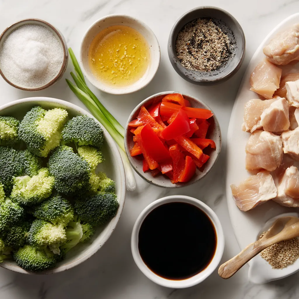 Gathering the right ingredients makes cooking so much easier. I love using fresh chicken and bright veggies. The chicken breasts give great flavor and protein. Broccoli adds crunch and health. The red bell pepper makes the dish colorful.