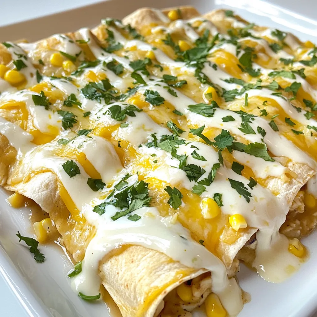 Delicious and creamy enchiladas filled with shredded chicken, corn, and black beans, topped with a rich white sauce and melted cheese.