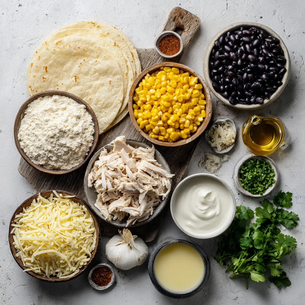 These ingredients come together to create a rich and creamy flavor. You can use rotisserie chicken for a quick option. Fresh corn adds a sweet crunch, while black beans bring fiber and protein. Monterey Jack cheese melts beautifully, giving a rich taste. Flour tortillas help wrap up all the goodness inside.