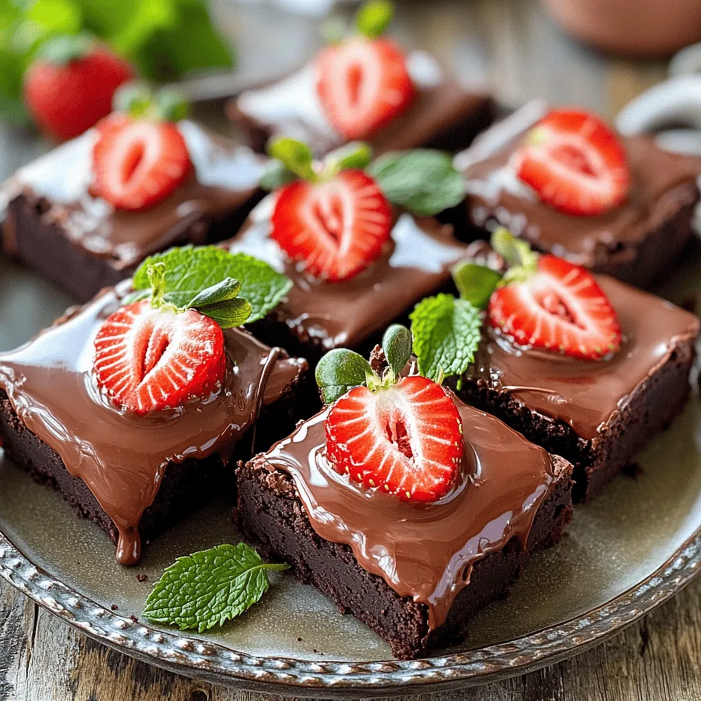 - 1 cup unsweetened cocoa powder - 1 cup granulated sugar - 1/2 cup brown sugar, packed - 1/2 cup unsalted butter, melted - 1/4 cup vegetable oil - 4 large eggs - 1 teaspoon vanilla extract - 1 cup all-purpose flour - 1/2 teaspoon baking powder - 1/4 teaspoon salt - 1 cup fresh strawberries, hulled and halved - 1 cup semi-sweet chocolate chips - 1 tablespoon coconut oil For these chocolate dipped strawberry brownies, you need simple yet tasty ingredients. Each plays a key role in creating a rich and fudgy treat. The unsweetened cocoa powder gives the brownies their deep chocolate flavor. You will mix it with both types of sugar for sweetness. The brown sugar adds a little moisture, making the brownies soft. Melted unsalted butter and vegetable oil help keep the brownies rich and moist. The eggs give the brownies structure and help them rise. Vanilla extract adds a nice aroma and flavor. The all-purpose flour, baking powder, and salt balance the sweetness and enhance the texture. Fresh strawberries bring a burst of fruitiness, while the semi-sweet chocolate chips create melty pockets of chocolate. Lastly, a bit of coconut oil helps you melt the chocolate smoothly, making dipping easy. Each ingredient contributes to a delightful experience in every bite. 1. Preheat your oven to 350°F (175°C). Grease a 9x13-inch baking pan or line it with parchment paper. This will help your brownies come out easily. 2. In a large mixing bowl, combine 1 cup of unsweetened cocoa powder, 1 cup of granulated sugar, and 1/2 cup of packed brown sugar. Mix well to blend the dry ingredients. 3. Next, add 1/2 cup of melted unsalted butter and 1/4 cup of vegetable oil. Stir until the mixture is smooth. 4. Now, add 4 large eggs one at a time, mixing well after each addition. Then, stir in 1 teaspoon of vanilla extract for a nice flavor boost. 5. In another bowl, whisk together 1 cup of all-purpose flour, 1/2 teaspoon of baking powder, and 1/4 teaspoon of salt. Gradually add this dry mixture to the wet mixture, stirring just until combined. 6. Fold in half of the halved fresh strawberries. Pour the batter into the prepared baking pan and spread it evenly. 1. Bake the brownies for 25-30 minutes. To check for doneness, insert a toothpick into the center. If it comes out with a few moist crumbs, they are ready. 2. Allow the brownies to cool in the pan for about 10 minutes, then transfer them to a wire rack to cool completely. 1. While the brownies cool, melt 1 cup of semi-sweet chocolate chips and 1 tablespoon of coconut oil in a microwave-safe bowl. Heat in 30-second intervals, stirring until smooth. 2. Dip the remaining strawberry halves into the melted chocolate. Allow any excess chocolate to drip off. Place them on a parchment-lined tray to cool and set. 3. Once the brownies have cooled, cut them into squares. Top each brownie with a chocolate-dipped strawberry before serving. To make the best brownies, focus on texture. Aim for a fudgy, rich bite. Use the right ingredients at the right temperature. Room temperature eggs mix better, giving a smooth batter. Melted butter helps create a moist brownie. When melting chocolate, safety is key. Use a microwave-safe bowl. Heat chocolate chips and coconut oil in short bursts. Start with 30 seconds, stir, then heat again. Repeat until smooth. This method prevents burning chocolate. Garnish your brownies for a beautiful look. Place fresh mint leaves around the brownies. Drizzle melted chocolate on top for a fancy touch. Serve your brownies on a nice platter. This adds to the fun! {{image_2}} You can make your Chocolate Dipped Strawberry Brownies even more fun. Adding nuts, like walnuts or pecans, gives a nice crunch. You can also mix in other fruits, such as raspberries or bananas, to change the flavor. If you want a twist, try using different types of chocolate. Dark chocolate chips add richness, while white chocolate gives a sweet touch. Each choice makes the brownies unique and tasty. If you need gluten-free brownies, swap the all-purpose flour with almond flour or a gluten-free mix. This keeps the brownies soft and moist. For a vegan version, replace the eggs with flaxseed meal mixed with water. Use coconut milk instead of butter and choose dairy-free chocolate chips. These swaps let anyone enjoy these delicious brownies. Serving Chocolate Dipped Strawberry Brownies can be fun! Pair them with a scoop of vanilla ice cream or a dollop of whipped cream. The cold cream complements the warm brownies well. You can also arrange the brownies on a nice plate and add fresh mint leaves for decoration. Drizzle extra melted chocolate on top for a fancy touch. These ideas make your dessert look amazing and taste even better. To keep your chocolate dipped strawberry brownies fresh, store them at room temperature. Place them in an airtight container. This method keeps them moist and tasty for up to three days. If you want to store them longer, refrigeration is a good choice. Just wrap the brownies tightly in plastic wrap and place them in the fridge. This way, they can last up to a week. If you need to save your brownies for a later time, freezing is a great option. Wrap each brownie well in plastic wrap. Then, place them in a freezer-safe bag or container. This keeps them fresh for up to three months. When you're ready to enjoy them, take them out of the freezer. Thaw them in the fridge overnight or at room temperature for a few hours. This way, they will taste just as good as fresh! You can check if brownies are done by using a toothpick. Insert it in the center of the brownies. If it comes out with a few moist crumbs, they are ready. If it’s wet with batter, they need more time. Look for a slight shine on top and a firm edge. These signs show that your brownies are done and ready to cool. Yes, you can use frozen strawberries. Just make sure to thaw them first. After thawing, drain any excess liquid. This helps keep your brownies from getting too soggy. Frozen strawberries can add ni
