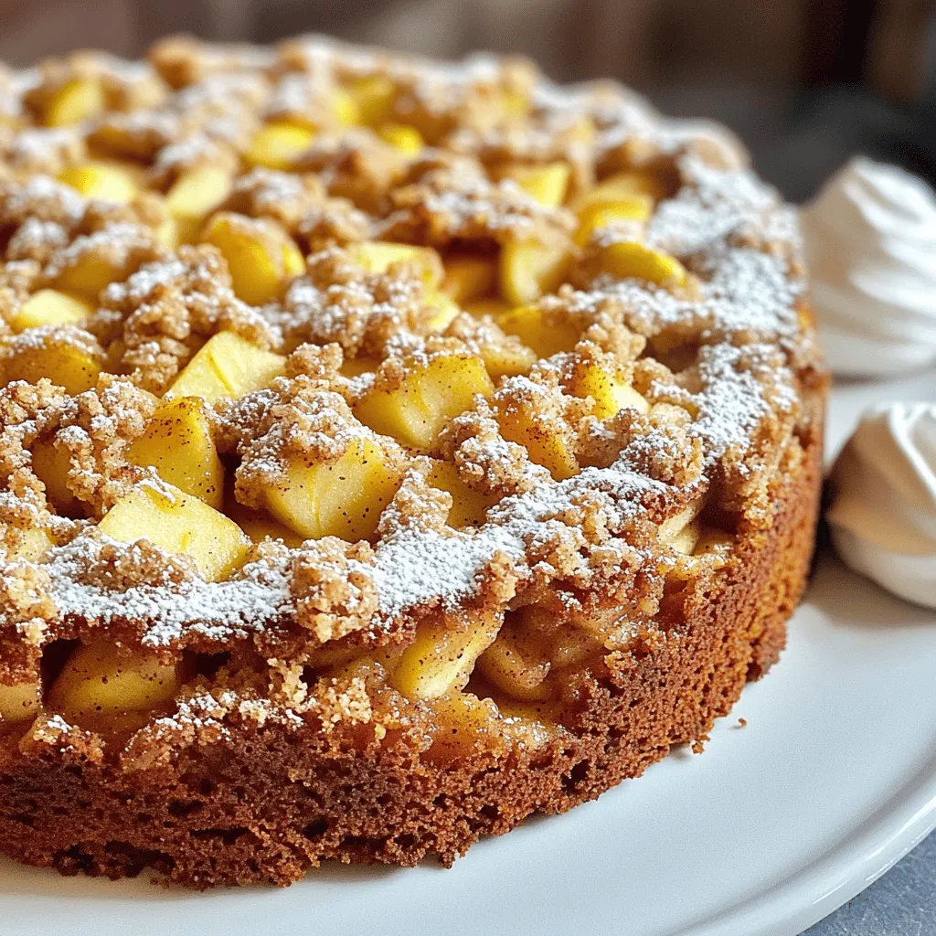 To make this Cinnamon Apple Crumble Coffee Cake, you will need the following items: - 2 cups all-purpose flour - 1 cup granulated sugar - 1/2 cup unsalted butter, softened - 1/2 cup brown sugar, packed - 1 teaspoon baking powder - 1 teaspoon baking soda - 1 teaspoon ground cinnamon - 1/2 teaspoon salt - 1 cup sour cream - 2 large eggs - 2 cups peeled and diced apples (any sweet variety, like Honeycrisp or Fuji) - 1/2 cup chopped walnuts (optional) For the crumble topping: - 1/2 cup all-purpose flour - 1/4 cup brown sugar, packed - 1 teaspoon cinnamon - 1/4 cup cold unsalted butter, cubed If you need to swap some ingredients, here are a few ideas: - Granulated sugar: You can use coconut sugar or maple sugar. - Unsalted butter: Try using coconut oil for a dairy-free option. - Sour cream: Greek yogurt works well as a substitute. - Apples: If you want a tart flavor, use Granny Smith apples. These swaps can change the taste a bit but still keep the cake tasty. To get the best flavor in your coffee cake, choose sweet apples. Here are my top picks: - Honeycrisp: They are sweet and juicy, perfect for baking. - Fuji: These apples are crisp and have a good balance of sweet and tart. - Gala: They are sweet and add a nice flavor to the cake. Using these apple types will give you a delicious, flavorful treat. Start by preheating your oven to 350°F (175°C). This helps the cake cook evenly. Grease a 9x13 inch baking dish with butter or line it with parchment paper. In a large bowl, cream together the softened butter, granulated sugar, and brown sugar until you have a light and fluffy mix. This step is key to a soft cake. Next, add the eggs one at a time. Mix well after each egg. Then, stir in the sour cream. In a separate bowl, whisk together the all-purpose flour, baking powder, baking soda, ground cinnamon, and salt. Slowly add this dry mix to your wet mix. Be careful not to over-mix; just blend until combined. Now, fold in the diced apples and walnuts, if you choose to use them. Make sure the apples are spread evenly throughout the batter. Pour the batter into the prepared dish and spread it out evenly. For the crumble topping, grab a medium bowl. Mix together the flour, brown sugar, and cinnamon. Add the cold, cubed butter. Use your fingers or a pastry cutter to combine the butter into the dry mix. You want it to be crumbly. It should resemble small pebbles. Once the crumble is ready, sprinkle it evenly over the cake batter. This topping adds a delightful crunch to each bite. Place your baking dish in the preheated oven. Bake for about 30-35 minutes. To check if it's done, insert a toothpick into the center. If it comes out clean, your cake is ready. Let the cake cool in the dish for about 10 minutes. After that, transfer it to a wire rack to cool completely. This step helps keep the cake from getting soggy. Enjoy the wonderful smell that fills your kitchen! To make your coffee cake fluffy, here are some tips: - Use room temperature ingredients. This helps them mix well. - Cream the butter and sugars until light. This adds air to the batter. - Don’t over-mix. Stir just until combined for a soft texture. - Use fresh baking powder and baking soda. This gives the cake a nice rise. Avoid these common mistakes to ensure success: - Don’t skip greasing the pan. This prevents sticking. - Measure flour correctly. Too much can make the cake dense. - Check the oven temp with a thermometer. An oven that is too hot can burn the cake. - Allow the cake to cool before slicing. This keeps the texture intact. This coffee cake shines on its own, but you can enhance it: - Serve warm with a sprinkle of powdered sugar. - Add a dollop of whipped cream for richness. - Pair with coffee or spiced tea for a cozy treat. - Try it with vanilla ice cream for a dessert twist. Enjoy these tips to make your Cinnamon Apple Crumble Coffee Cake truly irresistible! {{image_2}} To make this cake gluten-free, swap all-purpose flour with a gluten-free blend. Make sure the blend contains xanthan gum for the best texture. Your cake will still be soft and moist. You can enjoy the same great flavors and the warm spice of cinnamon. Always check that your other ingredients, like baking powder and sugar, are also gluten-free. You can change this cake based on what's in season. For fall, add chopped walnuts for a nice crunch. In summer, try using fresh berries like blueberries or raspberries. Each fruit adds its own flavor. You can also mix apples with pears for a unique twist. This keeps the cake fresh and fun all year round. To make a vegan version, replace eggs with flax eggs. Mix one tablespoon of ground flaxseed with three tablespoons of water and let it sit for five minutes. Use a vegan sour cream or unsweetened applesauce instead of regular sour cream. Replace the butter with coconut oil or vegan margarine. This way, you can enjoy a tasty cake that fits a plant-based diet. Storing your leftover Cinnamon Apple Crumble Coffee Cake is simple. First, let the cake cool completely. Then, cover it tightly with plastic wrap or foil. This helps keep the moisture in and stops the cake from drying out. You can also store it in an airtight container. It will stay fresh for up to three days at room temperature. If you want to keep it longer, consider freezing it. Freezing this cake is a great option if you want to save some for later. Start by cutting the cake into slices. Wrap each slice tightly in plastic wrap. Then, place them in a freezer-safe bag or container. Make sure to label the bag with the date. The cake can stay frozen for up to three months. When you’re ready to enjoy it, just take out the slices you need. To reheat your cake, you can use the oven or microwave. If using the oven, preheat it to 350°F (175°C). Place the slice on a baking sheet and heat for about 10 minutes. This method helps keep the cake moist. If you’re in a hurry, the microwave works too. Heat each slice for about 15-20 seconds. Just be careful not to overheat