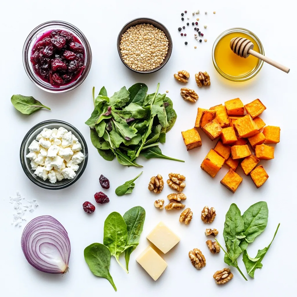 • Assemble the Salad: In a large salad bowl, add mixed greens, roasted sweet potatoes, cooked quinoa, crumbled feta, toasted walnuts, dried cranberries, and red onion.