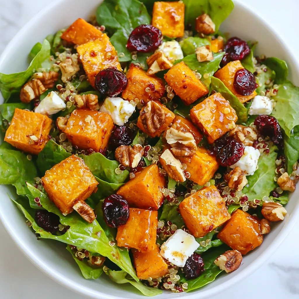 A vibrant salad featuring mixed greens, roasted sweet potatoes, quinoa, and a tangy cranberry dressing.