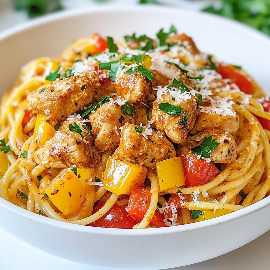 These ingredients come together to create a creamy, flavorful dish. The Cajun seasoning adds a nice kick, while the heavy cream makes it rich and smooth. You can pick any color of bell pepper to brighten your dish. Enjoy the blend of flavors from the chicken, veggies, and spices. This dish serves about four people, making it perfect for a family dinner or a gathering with friends.