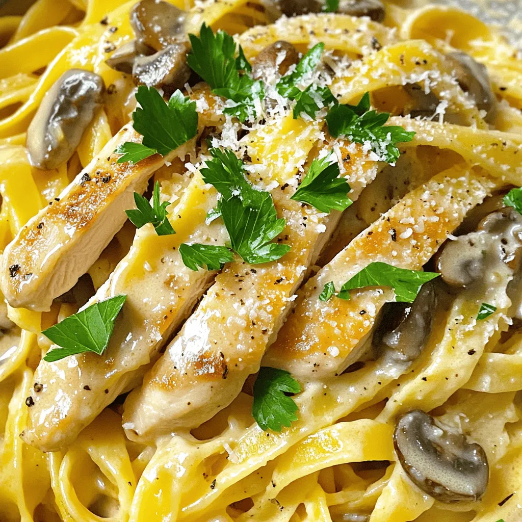 In the same skillet, add 1 cup of sliced mushrooms. Cook them for about 5 minutes until they are golden and soft. Next, add 2 cloves of minced garlic and sauté for another minute until it smells great. Pour in 1 cup of chicken broth and stir to mix, scraping any tasty bits from the bottom of the skillet. Let this simmer for about 3 minutes to reduce slightly. Lower the heat and stir in 1 cup of heavy cream. Let it simmer for 2-3 minutes until the sauce thickens. Finally, return the cooked chicken to the skillet and add the drained fettuccine. Toss everything together, adding a bit of the reserved pasta water if the sauce seems too thick. Cook for another 1-2 minutes until everything is warm.