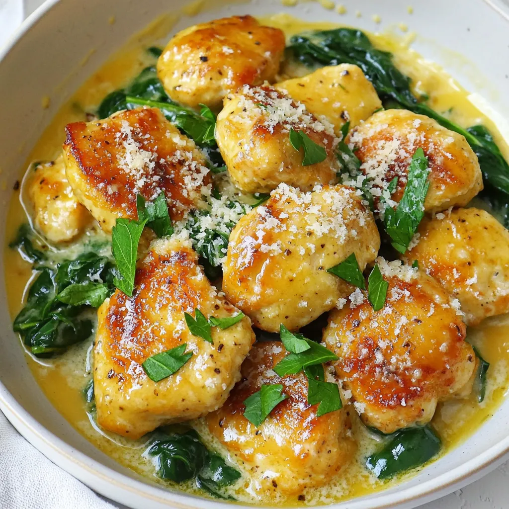 Delicious bite-sized chicken pieces in a creamy garlic sauce with spinach and Parmesan.