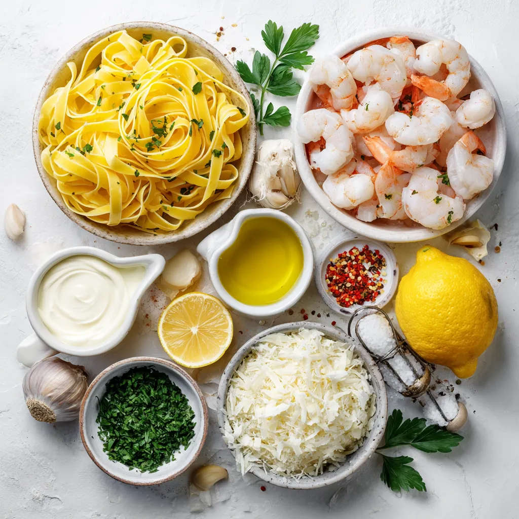 To make creamy garlic shrimp pasta, gather these simple ingredients: