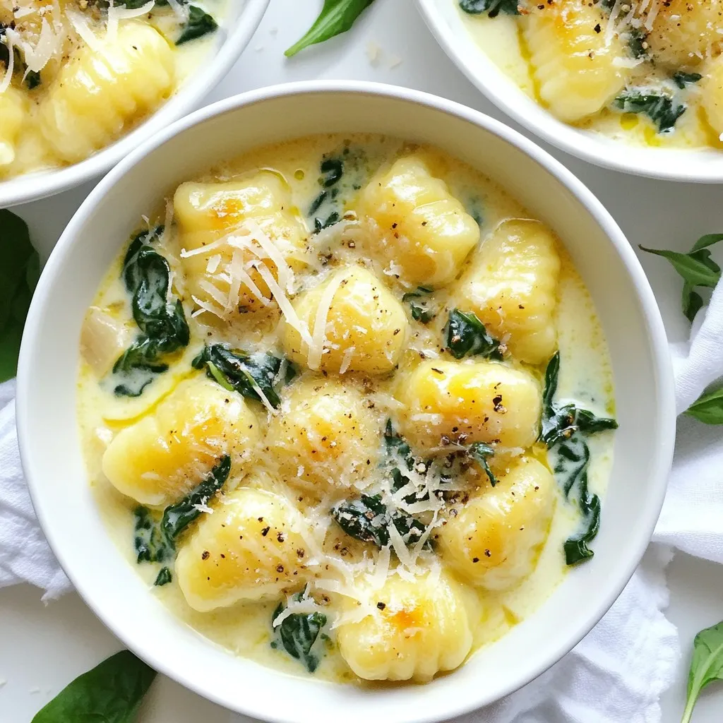 To make your creamy gnocchi with spinach, you need simple yet rich ingredients. Here's what you'll need: - 1 pound store-bought gnocchi - 2 cups fresh spinach, chopped - 1 cup heavy cream - 1 cup grated Parmesan cheese - 2 cloves garlic, minced - 1 tablespoon olive oil - Salt and pepper to taste - Optional seasonings: 1/4 teaspoon nutmeg, pinch of red pepper flakes Each ingredient plays a key role in creating that creamy goodness. The gnocchi gives a soft texture. Fresh spinach adds color and nutrients. The heavy cream and Parmesan cheese blend into a delicious sauce. Garlic brings in a nice flavor, while olive oil helps everything cook evenly. If you want a little extra warmth, the nutmeg and red pepper flakes are great choices. They can make your dish stand out. This list is not only easy to find but also perfect for making a comforting meal. {{ingredient_image_1}} - Bring a large pot of salted water to a boil. - Add 1 pound of store-bought gnocchi and cook according to package instructions, usually 2-3 minutes. - Once they float, drain the gnocchi and set aside. - Heat 1 tablespoon of olive oil in a large skillet over medium heat. - Add 2 cloves of minced garlic and sauté for about 1 minute until fragrant. - Add 2 cups of chopped spinach to the skillet. - Cook until wilted, which takes about 2-3 minutes. - Pour in 1 cup of heavy cream and let it simmer for a couple of minutes. - Stir in 1 cup of grated Parmesan cheese until melted and well combined. - Add the cooked gnocchi to the skillet. - Toss gently to coat them in the creamy sauce. - Season with salt, pepper, and optional nutmeg or red pepper flakes to taste. - Remove from heat and serve in shallow bowls. - Drizzle with extra olive oil, sprinkle with more Parmesan, and garnish with fresh basil or parsley. To get the best creaminess, adjust the cream and cheese ratios. If you want it richer, add more cream or cheese. Use a good quality Parmesan. Freshly grated cheese melts better and adds a nice flavor. To make your dish pop, add spices and herbs. I suggest garlic powder, black pepper, or even a dash of lemon zest. If you like heat, sprinkle in red pepper flakes. For richness, try a pinch of nutmeg. It elevates the dish wonderfully. When sautéing garlic, keep the heat low to prevent burning. Garlic cooks fast, so stir it often. For perfectly cooked spinach, add it to the skillet when the garlic is fragrant. Cook just until it wilts. This keeps it bright and tender. Pro Tips Use Fresh Ingredients: Fresh spinach and high-quality Parmesan cheese will elevate the flavor of the dish significantly. Adjust the Creaminess: If you prefer a lighter dish, you can substitute half of the heavy cream with vegetable broth. Flavor Boost: Consider adding a squeeze of lemon juice just before serving for a bright, fresh flavor contrast. Make it Ahead: You can prepare the creamy sauce in advance and store it in the refrigerator. Just reheat and add the gnocchi before serving. {{image_2}} You can easily add protein to creamy gnocchi. Chicken, shrimp, or tofu work great. - Chicken: Cook diced chicken breast in the skillet until golden. This adds a nice texture. - Shrimp: Sauté shrimp until pink and tender. It cooks quickly and adds a seafood twist. - Tofu: Use firm tofu for a plant-based option. Sauté it in the skillet until crispy. Each protein adds a different flavor. Adjust cooking time based on what you choose. Making this dish vegetarian or vegan is simple. You can substitute heavy cream easily. - Vegetarian: Use almond milk or oat milk mixed with a bit of cornstarch for thickness. - Vegan: Try coconut cream for a rich texture. It also adds a hint of sweetness. For cheese, look for vegan cheese shreds. They melt nicely and keep the dish creamy. Incorporating seasonal vegetables can boost flavor and nutrition. - Spring: Try asparagus or peas for a fresh crunch. - Summer: Add zucchini or bell peppers for a colorful mix. - Fall: Incorporate roasted butternut squash for a sweet touch. Pair these veggies with fresh herbs like basil or thyme. They enhance the dish’s taste and aroma. To store your creamy gnocchi, use airtight containers. Glass or plastic containers work well. Make sure the dish cools down before sealing. This helps keep it fresh. In the refrigerator, it lasts for 3 to 4 days. For reheating, use a skillet over low heat. This method helps keep the cream smooth. Stir often to avoid sticking. You can also use the microwave. Heat in short bursts and stir in between. This helps warm it evenly. You can freeze creamy gnocchi for later use. Before freezing, let it cool completely. Use freezer-safe bags or containers. To thaw, place it in the fridge overnight. When ready to eat, reheat slowly on the stove. This keeps the texture creamy and tasty. Avoid freezing it for too long, as the cream may separate. Yes, you can use frozen gnocchi. Frozen gnocchi cooks fast, just like fresh. You don't need to thaw it. Simply drop it into boiling water. Cook according to the package instructions. Usually, it takes about 2-3 minutes. When it floats, it's ready. Frozen gnocchi often has a similar taste and texture as fresh. It’s a great time-saver! To make this dish gluten-free, use gluten-free gnocchi. Many brands offer gluten-free options made from potato or rice flour. You can also make homemade gluten-free gnocchi. For the sauce, heavy cream is naturally gluten-free. Just check labels for any added ingredients. This way, you can enjoy creamy gnocchi without gluten! Creamy gnocchi pairs well with simple side dishes. A fresh green salad adds a nice crunch. Try a Caesar or mixed greens salad with a light dressing. Roasted vegetables also work great, like asparagus or broccoli. For a heartier meal, serve it with grilled chicken or shrimp. These options balance the creaminess of the dish. Yes, you can substitute heavy cream with lighter options. Use half-and-half for a lower-fat choice. Coconut milk is another good option for a dairy-free version. For a r