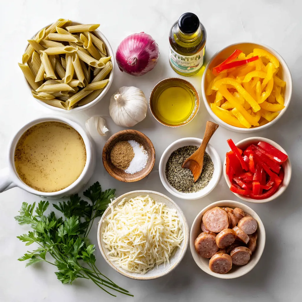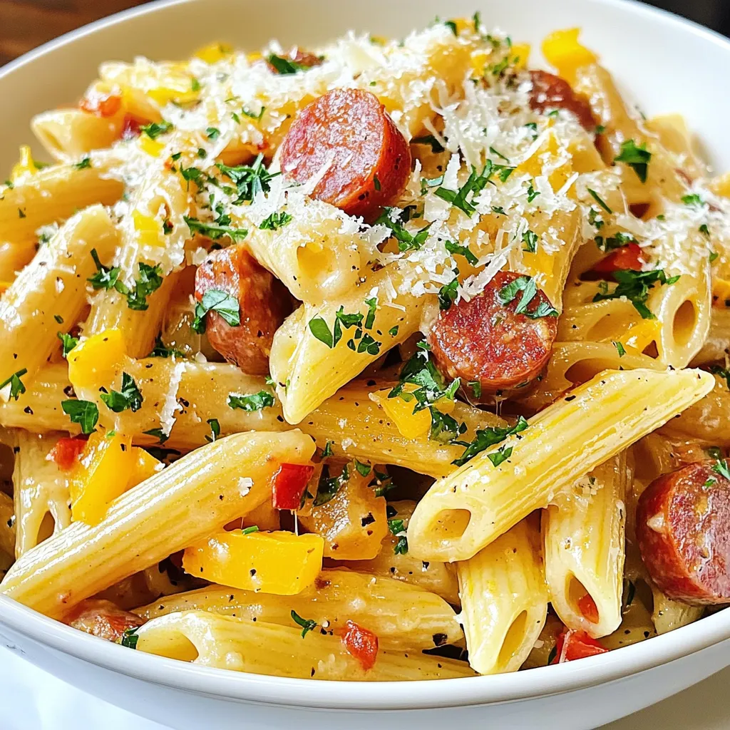 A delicious and creamy pasta dish featuring kielbasa and colorful bell peppers.