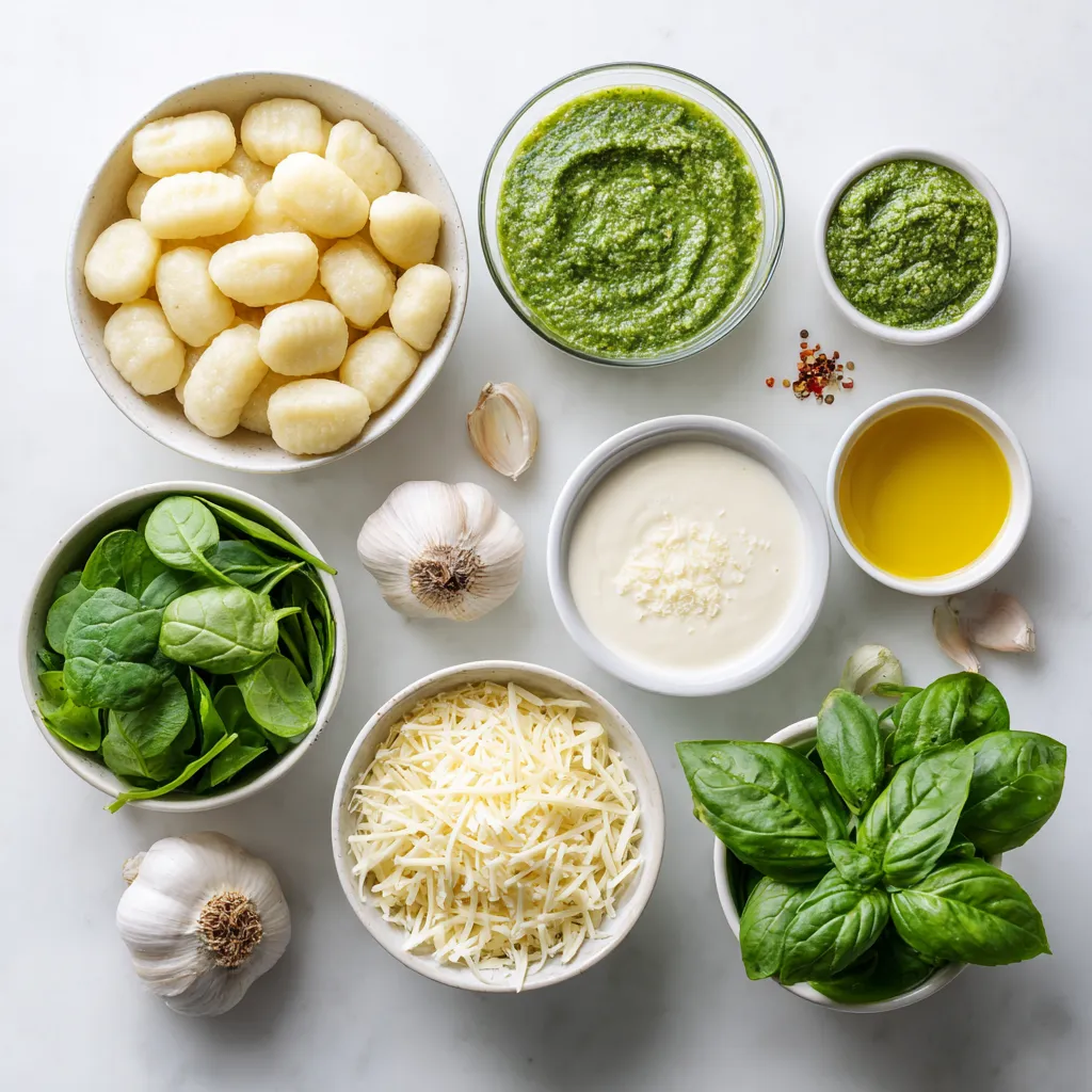 Start by gathering all your ingredients. You will need potato gnocchi, fresh spinach, basil pesto, heavy cream, mozzarella cheese, Parmesan cheese, garlic, olive oil, salt, pepper, red pepper flakes, and fresh basil leaves. This dish is quick and easy. You can make it in about 40 minutes.