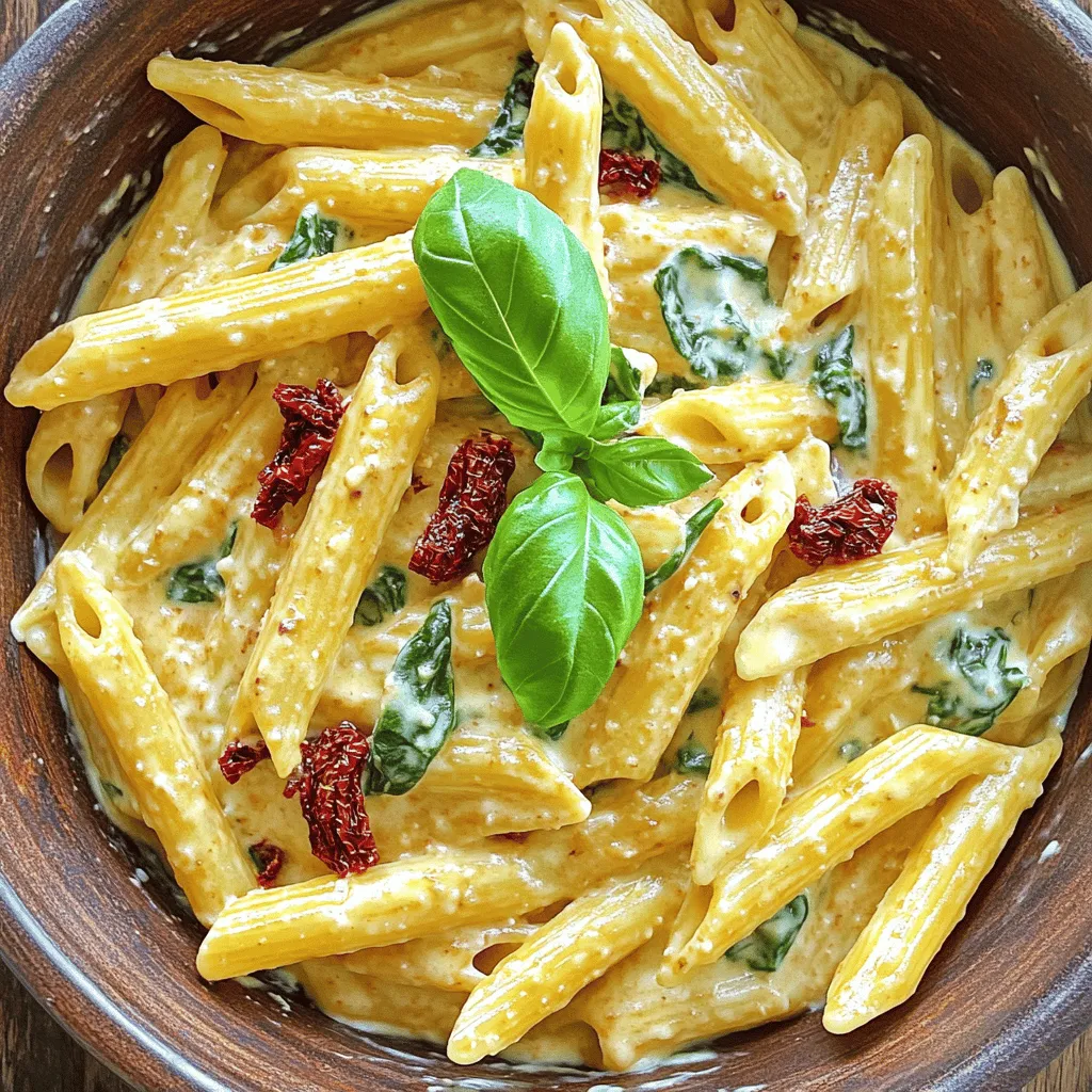 - 12 oz penne pasta - 1 cup sun-dried tomatoes in oil, drained and chopped - 1 cup heavy cream - 1 teaspoon garlic powder - 1 teaspoon Italian seasoning - ½ cup grated Parmesan cheese - 1 tablespoon olive oil - 1 cup fresh spinach, chopped - Salt and pepper to taste - Fresh basil leaves for garnish To make this dish, you need a few key ingredients. First, you’ll need penne pasta. This pasta shape holds the sauce well. Next, sun-dried tomatoes bring a rich taste. They add a nice zing to every bite. Heavy cream gives the sauce its creamy texture. Garlic powder adds flavor without the fuss. Italian seasoning blends herbs for a balanced taste. Grated Parmesan cheese is essential for a cheesy finish. Olive oil adds richness to the sauce. Fresh spinach gives color and nutrients. Lastly, salt and pepper enhance all the flavors. - Additional cheese for topping - Various herbs for extra flavor - Protein options like chicken or shrimp You can customize this dish with optional ingredients. If you love cheese, add more on top. Fresh herbs can boost flavor too. You could try thyme or oregano. For a heartier meal, add proteins like chicken or shrimp. These options make the dish even more filling. To cook penne pasta al dente, fill a large pot with water. Add a good amount of salt to the water. This step is key because it flavors the pasta as it cooks. Bring the water to a boil before adding the penne. Cook the pasta according to the package directions, usually about 10-12 minutes. Test a piece before draining. It should be tender but still firm. After cooking, drain the pasta, and set it aside. For the sauce, start by heating olive oil in a large skillet over medium heat. Once hot, add the drained and chopped sun-dried tomatoes. Sauté them for about 2-3 minutes until they smell great. Next, sprinkle in garlic powder and Italian seasoning. Stir these in to blend the flavors. Now pour in the heavy cream and let it come to a gentle simmer. Cook for about 5 minutes, stirring often, until the sauce thickens. Adding grated Parmesan cheese will make the sauce creamy. Stir until the cheese melts completely into the sauce. Finally, toss in the chopped spinach and cook for another 2-3 minutes until it wilts down. Now, it’s time to bring it all together. Add the cooked penne pasta to the creamy sauce in the skillet. Use a gentle tossing technique to coat all the pasta evenly. This helps ensure every bite is full of flavor. Taste the dish, and season with salt and pepper as needed. Serve hot, garnishing with fresh basil leaves for a lovely touch. To adjust the thickness of your sauce, you can add more cream. If it’s too thick, stir in a splash of pasta water. This water carries starch from the pasta, helping to create a silky texture. Balancing flavors is key. Always taste your sauce. If it feels flat, add salt, pepper, or a pinch of Italian seasoning. This will lift the dish and bring out the rich flavors. When serving, a large bowl adds a homey feel. Individual plates look fancy. Sprinkle more Parmesan on top for a cheesy touch. Fresh basil leaves add color and aroma. Pair this dish with a light salad or garlic bread. A crisp white wine, like Pinot Grigio, enhances the creamy flavors. For non-drinkers, a sparkling water with lemon is refreshing. One common mistake is overcooking the pasta. It should be al dente, or slightly firm. This helps the pasta hold its shape and texture. Another mistake is skipping seasoning. The sauce needs salt and pepper to shine. Even if you think the sun-dried tomatoes bring enough flavor, taste and adjust. Never underestimate the power of a well-seasoned dish! {{image_2}} You can make this dish fit your needs. For a gluten-free option, use rice penne or chickpea pasta. Both choices taste great and stay firm. If you want a dairy-free version, try coconut cream or cashew cream. They give a rich taste without dairy. To boost flavor, add more veggies. Bell peppers bring sweetness, and mushrooms add earthiness. Just sauté them with the sun-dried tomatoes. For protein, chicken or shrimp work well. Cook the meat before adding it to the sauce for a hearty meal. If you want a twist, try a tomato-based sauce. Use diced tomatoes instead of cream. This gives a light and fresh taste. Another option is pesto sauce. It adds a bright and herby flavor, perfect for summer meals. To keep your creamy sun-dried tomato penne fresh, let it cool first. Place it in an airtight container. Store it in the fridge for up to 3 days. Be sure to label the container with the date. This way, you know when to eat it. When reheating, use a skillet over low heat. Add a splash of milk or cream to keep it creamy. Stir often to blend the sauce with the pasta. Heat until just warm, about 5-7 minutes. Avoid high heat; it may dry out or curdle. Yes, you can freeze creamy pasta dishes! However, the texture may change slightly. To freeze, let it cool completely. Place it in a freezer-safe container. It can last up to 2 months. When ready to eat, thaw it overnight in the fridge. Reheat slowly in a skillet, adding a bit of cream for smoothness. Enjoy your creamy sun-dried tomato penne even after freezing! This dish lasts about 3 to 4 days in the fridge. Store it in an airtight container. Make sure it cools down before sealing. This keeps the pasta fresh and tasty. Yes, you can prepare it ahead. Cook the pasta and make the sauce separately. Store each in the fridge. When ready to eat, mix them and heat gently. This way, you save time on busy days. Pair this dish with a simple salad or garlic bread. A fresh green salad brightens the meal. For drinks, try white wine or sparkling water. These add a nice touch to your dinner. In this blog post, we explored how to make creamy sun-dried tomato penne. We covered main and optional ingredients, cooking instructions, and tips for success. You learned about common mistakes, variations, and storage methods to keep your dish fresh. Final thoughts: This pasta dish is rich, tasty, and