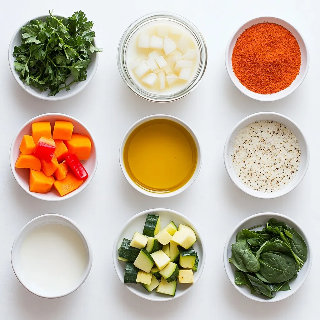 These ingredients create a rich and creamy texture. The olive oil adds a nice base flavor. Onions and garlic give the soup aromatic warmth. Carrots, zucchini, and bell peppers add color and crunch. Spinach gives it a fresh pop, while coconut milk adds creaminess. Nutritional yeast gives a cheesy taste if you want that extra boost. You can adjust salt and pepper to your liking.