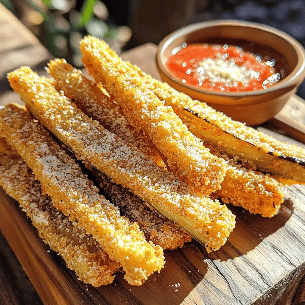 To make these tasty fries, you need: - 1 large eggplant, sliced into fries (about 1/4 inch thick) - 1 cup breadcrumbs (panko for extra crispiness) - 1/2 cup grated Parmesan cheese - 2 large eggs, beaten - 1 teaspoon garlic powder - 1 teaspoon onion powder - 1/2 teaspoon smoked paprika - Salt and pepper to taste - 2 tablespoons olive oil (for drizzling) These ingredients work together to create a crunchy, flavorful snack. The eggplant provides a soft texture inside, while the panko and cheese give a nice crispy crust. You can add extra ingredients to make these fries even better. Try these options: - Fresh herbs like parsley or basil for a fresh taste - Red pepper flakes for some heat - Grated lemon zest for a bright flavor These options allow you to customize your fries to fit your taste. If you don’t have all the ingredients, don’t worry! Here are some easy swaps: - Use regular breadcrumbs instead of panko if you prefer. - Swap Parmesan cheese with any hard cheese like Pecorino. - You can use egg substitutes like flaxseed meal mixed with water for a vegan option. These substitutions can help you make the fries with what you have on hand. Remember, the goal is to enjoy your snack! First, wash the eggplant well. Remove the ends and slice it into fries, about 1/4 inch thick. This size helps them cook evenly. If you find the eggplant bitter, sprinkle some salt over the slices. Let them sit for about 30 minutes. This step helps draw out moisture and bitterness. Rinse and pat them dry before cooking. You'll love how they taste after this prep. Now, gather your ingredients for the breading. In a large bowl, mix the breadcrumbs, grated Parmesan cheese, garlic powder, onion powder, smoked paprika, salt, and pepper. Stir well to blend all the flavors. In another bowl, beat the two eggs. This will be your wet mix. Set your breading station up with the egg bowl on one side and the breadcrumb mix on the other. This setup makes it easy to coat your eggplant fries. Preheat your air fryer to 400°F (200°C) for about 5 minutes. It’s important to have it hot before you start. Dip each eggplant fry into the beaten eggs, letting the excess drip off. Then, coat the fry in the breadcrumb mixture. Press lightly to adhere the breading well. Place the breaded fries in the air fryer basket in a single layer. Avoid overcrowding; this keeps them crispy. Drizzle a little olive oil over the top before cooking. Air fry for 15-18 minutes, flipping halfway. Check for that golden color and crisp texture. Once done, let them cool slightly before serving. Enjoy your tasty snack! To get your eggplant fries crispy, start with a dry eggplant. Salt the slices for 10-15 minutes to pull out moisture. This step helps remove bitterness and ensures they fry up nice and crisp. After salting, rinse and pat dry with paper towels. Use panko breadcrumbs for extra crunch. They create a light, airy coating that holds up during cooking. Finally, drizzle a bit of olive oil before frying. This helps achieve that perfect golden brown you want. Set up your breading station for easy coating. Use one bowl for beaten eggs and another for the breadcrumb mix. Dip each eggplant slice into the egg, letting the excess drip off. Then, press it firmly into the breadcrumb mix. Make sure to coat every side evenly. Work in small batches to avoid clumping. Overcrowding leads to soggy fries. Place the breaded fries in a single layer in the air fryer basket. This allows hot air to circulate and crisp them up well. One common mistake is skipping the salting step. This can lead to soggy fries. Another error is overcrowding the air fryer. Always leave space between the fries. If you overcrowd, they will steam instead of fry. Also, don’t forget to flip them halfway through cooking. This ensures even crispiness on both sides. Finally, check the fries as they cook. If they need more time, air fry them a bit longer for extra crunch. {{image_2}} You can spice up your eggplant fries! To make spicy Parmesan eggplant fries, add cayenne pepper to your breadcrumb mix. Start with 1/2 teaspoon and taste the blend. Adjust to your heat preference. You can also add crushed red pepper flakes for extra kick. This will give your fries a zesty flavor that’s fun to eat. Want to make a vegan version? It's easy! Instead of eggs, use a flaxseed mix. Combine 1 tablespoon of ground flaxseed with 2.5 tablespoons of water. Let it sit for about 5 minutes until it thickens. Dip your eggplant fries in this mix before coating them. Use vegan cheese or nutritional yeast instead of Parmesan. You’ll still get a tasty crunch! Don't stop at basic spices! Consider adding different flavors to your breadcrumb mix. Try Italian seasoning for a herbaceous twist. You can also mix in some lemon zest for brightness. If you love garlic, add more garlic powder to enhance the flavor. Experiment with these ideas to find your favorite combo! To keep your leftover eggplant fries fresh, let them cool first. Place them in an airtight container. You can store them in the fridge for up to three days. Make sure they are not stacked on top of each other to avoid sogginess. When you are ready to eat your leftover fries, reheating is key. Preheat your air fryer to 350°F (175°C). Arrange the fries in a single layer in the basket. Heat them for about 5-7 minutes. This method helps them regain their crunch. If you want to store your eggplant fries for longer, freezing is a great option. Lay the fries in a single layer on a baking sheet. Freeze them for about one hour until solid. Then transfer them to a freezer bag. They can last up to three months in the freezer. When you’re ready to eat, cook them straight from frozen in the air fryer. Adjust the cooking time to about 20-25 minutes for crispy fries. To make eggplant fries less bitter, you can salt them. After slicing the eggplant, sprinkle salt on the fries. Let them sit for about 30 minutes. This draws out moisture and reduces bitterness. Rinse the fri