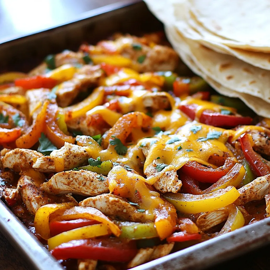 A quick and delicious chicken fajita bake with bell peppers, onions, and melted cheese.