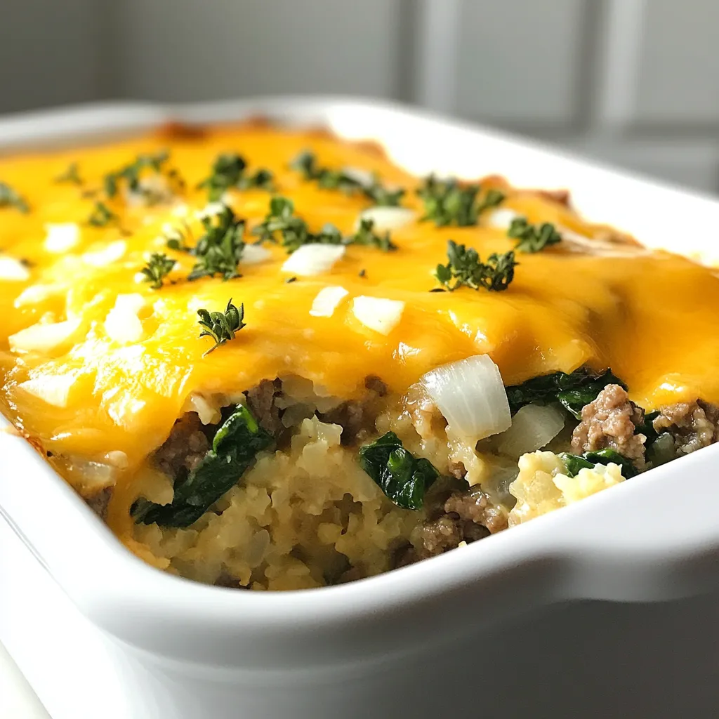 A delicious and easy keto-friendly casserole made with ground beef, cauliflower rice, and cheese.