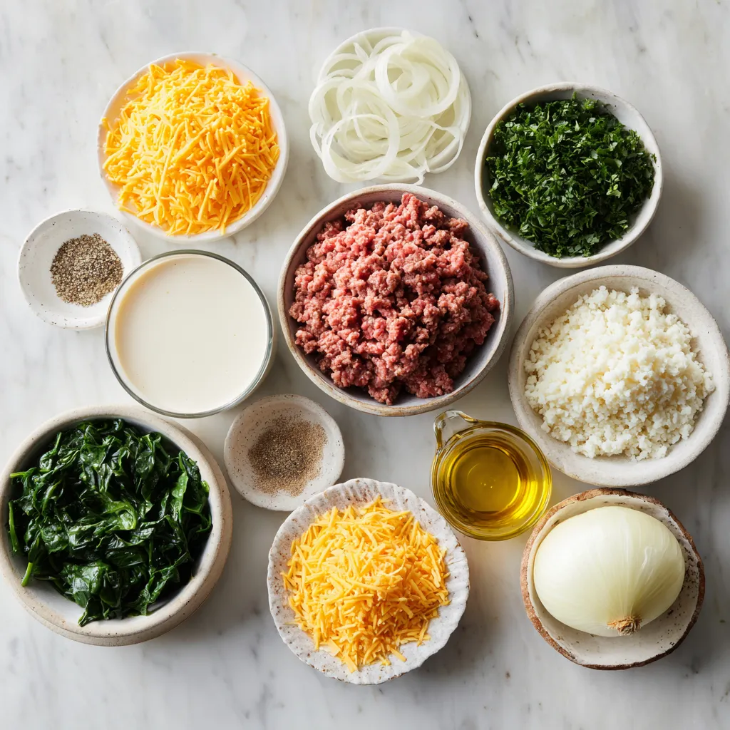 Start by preheating your oven to 375°F (190°C). This sets the stage for baking. Next, grab a large skillet and add 2 tablespoons of olive oil. Turn the heat to medium. Once hot, toss in 1/2 cup of diced onions. Sauté them until they turn translucent, which takes about 3 to 4 minutes. Now, add in 1 pound of ground beef. Cook it for about 5 to 7 minutes until it’s browned. If there’s excess fat, drain it off. After that, stir in 1 cup of cauliflower rice and 2 cups of fresh spinach, chopped. Continue cooking for another 3 to 4 minutes until the spinach wilts.