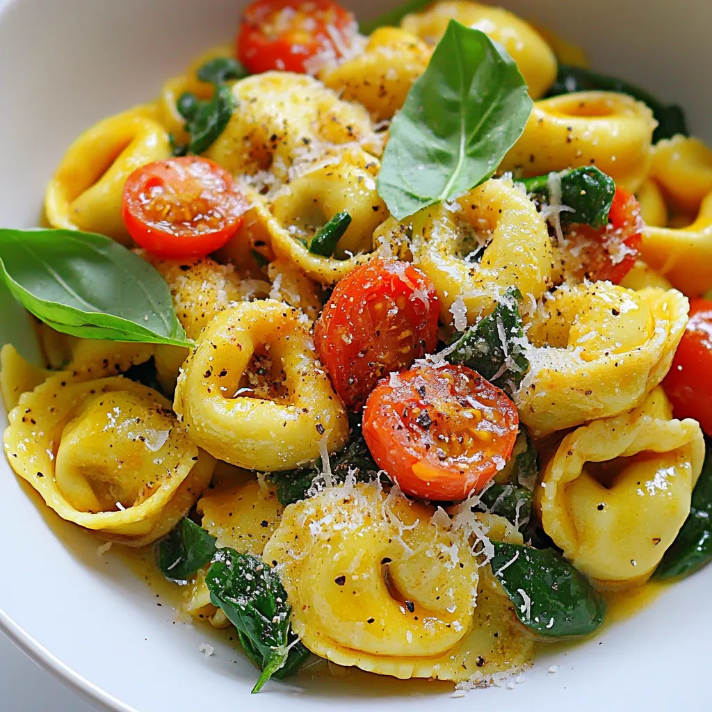 A delicious and easy-to-make dish featuring beef tortellini tossed in a garlic butter sauce with cherry tomatoes and spinach.