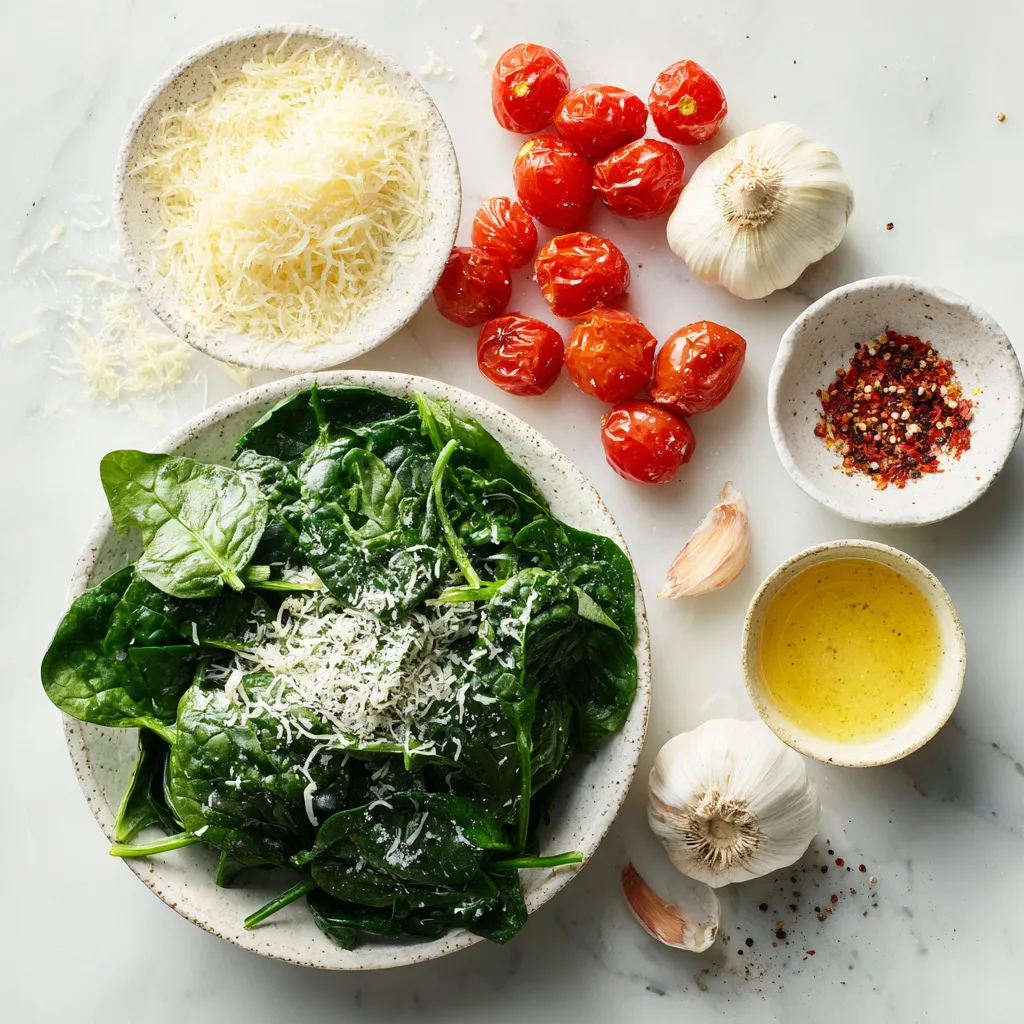 Cherry tomatoes add sweetness and color. Spinach gives a healthy boost and brightens the dish. Seasoning with salt and pepper allows you to tailor the flavor to your liking. Finally, Parmesan cheese adds creaminess and umami. Fresh basil leaves not only look nice but add a fresh aroma.