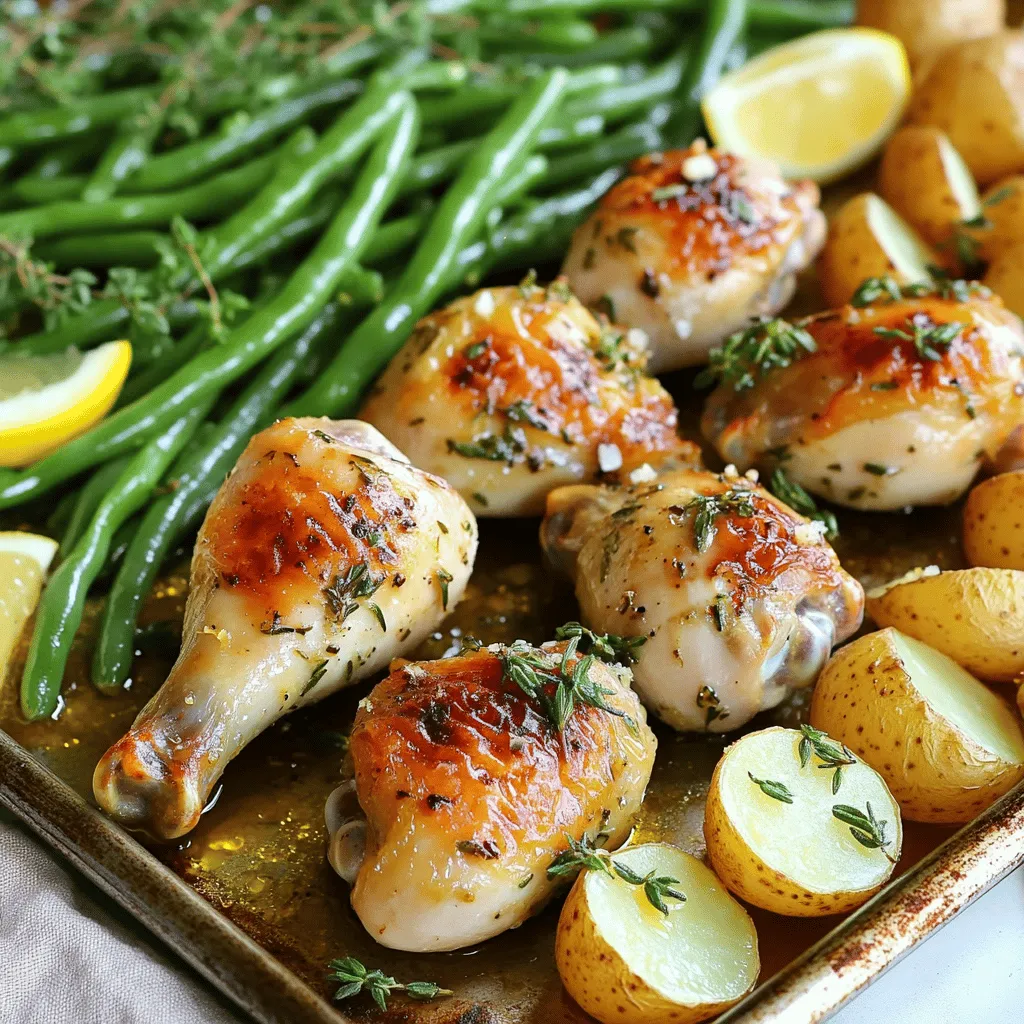 - 8 chicken drumsticks - 4 cloves garlic, minced - 2 tablespoons fresh rosemary, chopped - 2 tablespoons fresh thyme, chopped - 1 tablespoon fresh parsley, chopped - 3 tablespoons olive oil - Juice of 1 lemon - Salt and pepper to taste - 1 pound baby potatoes, halved - 2 cups green beans, trimmed - 1 teaspoon paprika To make Garlic Herb Chicken Drumsticks, you need simple yet fresh ingredients. The chicken drumsticks provide a juicy base. The garlic adds a strong, savory flavor. Fresh herbs like rosemary, thyme, and parsley bring brightness and depth. Olive oil helps the marinade stick and keeps the chicken moist. Lemon juice adds a tangy kick, balancing the richness of the chicken. Salt and pepper enhance all the flavors. The baby potatoes give you a hearty side. They will roast up tender and golden. Green beans add a fresh crunch. Each ingredient plays a role. Together, they create a dish that is easy and full of flavor. For the best taste, use fresh herbs and quality chicken. This recipe is perfect for family meals or gatherings. 1. Preheating the oven Set your oven to 425°F (220°C). This high heat helps the chicken and veggies cook fast. 2. Mixing the marinade In a large bowl, combine these ingredients: - 4 cloves garlic, minced - 2 tablespoons fresh rosemary, chopped - 2 tablespoons fresh thyme, chopped - 1 tablespoon fresh parsley, chopped - 3 tablespoons olive oil - Juice of 1 lemon - Salt and pepper to taste - 1 teaspoon paprika Stir until everything blends well. This mix adds great flavor. 3. Marinating the chicken Add 8 chicken drumsticks to your bowl. Make sure they get a good coat of marinade. Let them sit for at least 30 minutes. If you have time, marinate for one hour in the fridge. This step brings out the best taste in your chicken. 1. Arranging on the baking sheet Grab a large baking sheet. Place the marinated chicken drumsticks on one side. On the other side, add 1 pound of halved baby potatoes that you tossed with olive oil, salt, and pepper. This setup makes the most of the space. 2. Roasting the chicken and vegetables Put the baking sheet in the oven. Roast everything for 20 minutes. This gets the chicken cooking and starts to crisp the potatoes. 3. Checking doneness After 20 minutes, add 2 cups of trimmed green beans to the sheet. Drizzle with a bit of olive oil and season with salt and pepper. Roast for another 20-25 minutes. Check the chicken; it should reach an internal temperature of 165°F (75°C). The potatoes should look tender and golden. How long do you marinate for maximum flavor? Marinate the chicken for at least 30 minutes. For the best taste, let it sit for one hour. This allows the herbs and garlic to soak into the meat. What are the temperature benefits during marination? Marinate in the fridge. This keeps the chicken safe and helps flavors blend well. Warm chicken can grow bacteria. Always be safe and chill. How do you ensure even cooking? Arrange the chicken and vegetables with space between them. This helps hot air flow and cooks them evenly. Use a big enough sheet pan so nothing is crowded. What are tips for crispy skin? Pat the chicken dry before marinating. The less moisture, the crispier the skin. Also, roast the chicken at 425°F (220°C) for that perfect crunch. You can turn it halfway through to crisp all sides. {{image_2}} You can swap out the green beans for other vegetables. Try using broccoli, asparagus, or bell peppers. These veggies cook well and add color. They also bring different flavors to the dish. Make sure to cut them into similar sizes for even cooking. Root vegetables are another great choice. Carrots, parsnips, or sweet potatoes can add sweetness. They roast nicely alongside the chicken drumsticks. Just remember to cut them into smaller pieces to help them cook faster. You can add more excitement to the dish with spices or sauces. A sprinkle of chili powder can give a nice kick. If you like a sweet touch, try a drizzle of honey or maple syrup. Both will caramelize beautifully during roasting. Mixing herbs can also change the taste. Instead of rosemary, try basil or oregano for an Italian flair. For a fresh twist, combine mint and cilantro. The options are endless, so feel free to experiment with your favorite flavors. To store leftovers, let the chicken cool first. Place the chicken drumsticks and veggies in an airtight container. This keeps them fresh and tasty. You can store them in the fridge for up to three days. If you have extra marinade, keep it separate and use it later for flavor. For optimal storage, use glass or BPA-free plastic containers. These containers seal well and help prevent spills. Make sure to label the containers with the date, so you know when they were made. The best way to reheat chicken and vegetables is in the oven. Preheat your oven to 350°F (175°C). Place the chicken and veggies on a baking sheet. Heat for about 15-20 minutes. This method keeps them warm and juicy. If you need a quicker method, use the microwave. Place the chicken and veggies in a microwave-safe dish. Cover with a damp paper towel to keep moisture. Heat on medium power for 2-3 minutes, checking halfway through. To maintain texture, avoid reheating too long. Overcooking can make the chicken dry. If using the microwave, try to use short bursts of heat. This will help keep the chicken tender and the veggies crisp. To know when your chicken is done, check the internal temperature. You want it to reach 165°F (75°C). Use a meat thermometer to check the thickest part of the drumstick. If the thermometer reads this temperature, your chicken is safe to eat. Make sure to avoid touching the bone with the thermometer. This can give you a false reading. Let the chicken rest for a few minutes after cooking. This helps keep it juicy and tender. Yes, you can use skinless chicken drumsticks. However, you will need to make some changes. Skin helps keep the meat moist while cooking. Without it, the chicken may dry out. First, reduce the cooki