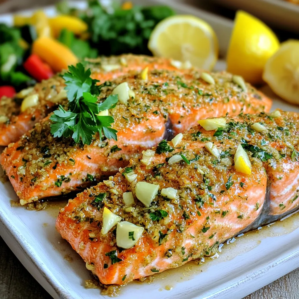 This garlic herb crusted salmon pairs well with many sides. Serve it with steamed broccoli or green beans. A light salad with lemon vinaigrette brightens the meal. Quinoa or rice can add a nice texture. For a fun twist, serve it on a bed of pasta. Don’t forget lemon wedges for extra zing!