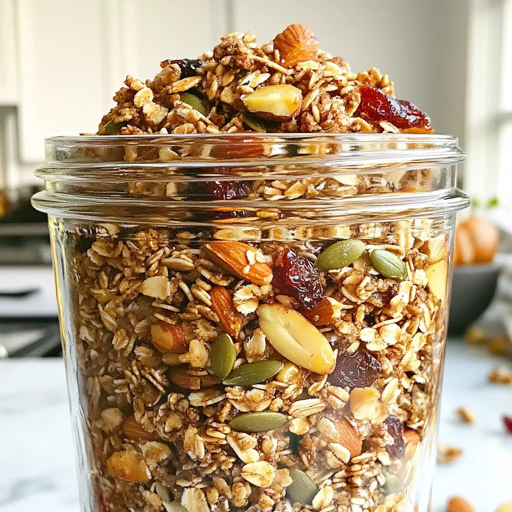 - 2 cups rolled oats - 1 cup nuts (pecans, walnuts, or almonds), chopped - 1/2 cup pumpkin seeds - 1/4 cup flaxseeds The base of gingerbread granola starts with rolled oats. They give the granola a hearty texture and help it crisp up nicely. I love adding chopped nuts for crunch. Pecan, walnut, or almond options work well. Pumpkin seeds bring a delightful nutty flavor, while flaxseeds add a boost of nutrition. - 1/2 cup honey or maple syrup - 1/4 cup coconut oil, melted - 1 teaspoon vanilla extract - 2 teaspoons ground ginger - 1 teaspoon ground cinnamon - 1/2 teaspoon ground nutmeg - 1/4 teaspoon ground cloves - Pinch of salt Sweetening your granola is key. Honey or maple syrup gives it a warm, rich flavor. I melt coconut oil to help the granola clump together. Vanilla extract adds a lovely depth of flavor. The spices—ginger, cinnamon, nutmeg, and cloves—bring the gingerbread vibe. Don’t forget a pinch of salt to balance all the sweetness. - 1/2 cup dried cranberries or raisins (optional) - Suggestions for other mix-ins Dried cranberries or raisins add a sweet and chewy contrast. You can also get creative! Try adding dark chocolate chips or coconut flakes for extra flavor. Mix-ins make your granola unique and fun, so feel free to experiment! {{ingredient_image_1}} First, preheat your oven to 350°F (175°C). While it warms up, line a large baking sheet with parchment paper. This helps the granola bake evenly and makes cleanup easy. In a large bowl, mix the following dry ingredients: - 2 cups rolled oats - 1 cup chopped nuts (pecans, walnuts, or almonds) - 1/2 cup pumpkin seeds - 1/4 cup flaxseeds - 2 teaspoons ground ginger - 1 teaspoon ground cinnamon - 1/2 teaspoon ground nutmeg - 1/4 teaspoon ground cloves - Pinch of salt Stir these together well. This mix will give your granola its tasty flavor and crunchy texture. In another bowl, whisk together these wet ingredients: - 1/2 cup honey or maple syrup - 1/4 cup melted coconut oil - 1 teaspoon vanilla extract Once mixed, pour this over the dry ingredients. Use a spatula to mix until everything is coated. This step is key for flavor and crunch. After mixing, spread the granola mixture evenly on your prepared baking sheet. Now, bake the granola in your preheated oven for 20-25 minutes. Stir it halfway through the baking time. This helps it brown evenly. Keep an eye on it to avoid burning. It should look golden and smell amazing when ready. When done, take the granola out of the oven. Let it cool completely on the baking sheet. It will get crisp as it cools. After cooling, you can stir in 1/2 cup of dried cranberries or raisins if you like. Finally, store the granola in an airtight container. It will stay fresh at room temperature for up to 2 weeks. Enjoy your crunchy gingerbread granola! - Stir the granola once halfway through baking. This helps it brown evenly. - Let the granola cool completely on the baking sheet. This step makes it crisp. - If you want more sweetness, add extra honey or maple syrup. - To boost the gingerbread flavor, add more ginger and spices. A pinch of allspice works too. - Serve the granola with yogurt or milk for a tasty breakfast. - For a beautiful look, layer granola with yogurt in clear jars. Add a sprinkle of cinnamon on top. Pro Tips Ensure Even Baking: Stir the granola halfway through the baking time to promote even browning and prevent burning. Cooling is Key: Let the granola cool completely on the baking sheet before transferring it to an airtight container; it will become crisp as it cools. Flavor Variations: Experiment with different nuts, seeds, or dried fruits based on your preference for a unique twist each time. Storage Tips: Store the granola in an airtight container at room temperature, and it will stay fresh for up to 2 weeks. {{image_2}} If you want a nut-free version of gingerbread granola, try using more seeds. You can replace nuts with extra pumpkin seeds or sunflower seeds. These options give a crunchy texture and add healthy fats. For a seed-free mix, use more oats or puffed rice. This keeps the granola light and tasty. Spices are key to great flavor. If you love a stronger taste, add more ginger or cinnamon. You can also change spices based on what you like. Try cardamom for a unique twist or skip the cloves if you want a milder flavor. Experimenting with spices makes your granola special. Honey and maple syrup work well, but you can use other sweeteners. Agave syrup is a great choice for a lighter sweetness. If you want less sugar, try stevia for a no-calorie option. Adjust the amount to fit your taste. Swapping sweeteners can change the flavor while keeping it delicious. Store your gingerbread granola in an airtight container. Glass jars work well. Keep it in a cool, dry place, away from sunlight. This will help maintain its crunch and flavor. Avoid storing it near the stove or in humid areas. Homemade granola lasts up to two weeks. Check the granola for freshness. If it smells off or has a weird taste, it may be stale. Stale granola can lose its crunch and flavor, making it less enjoyable. To revive stale granola, spread it on a baking sheet. Heat your oven to 300°F (150°C). Bake for about 5-10 minutes. This quick method will help restore some crunch. Let it cool before serving. Enjoy the fresh taste again! To make gingerbread granola vegan, swap honey with maple syrup. Use plant-based oil instead of coconut oil. You can also choose flaxseeds for added nutrition. Flaxseeds can replace eggs in recipes as they bind ingredients together. Yes, you can add fresh fruit! Fresh fruit like apples or bananas adds moisture and flavor. However, they can make the granola soggy. Dried fruits, like cranberries or raisins, keep granola crunchy. If using fresh fruit, add it just before serving. Gingerbread granola is healthy and filling. It contains oats, nuts, and seeds, which offer fiber and protein. A typical serving has about 200 calories. It also includes healthy fats from nuts and seeds. T